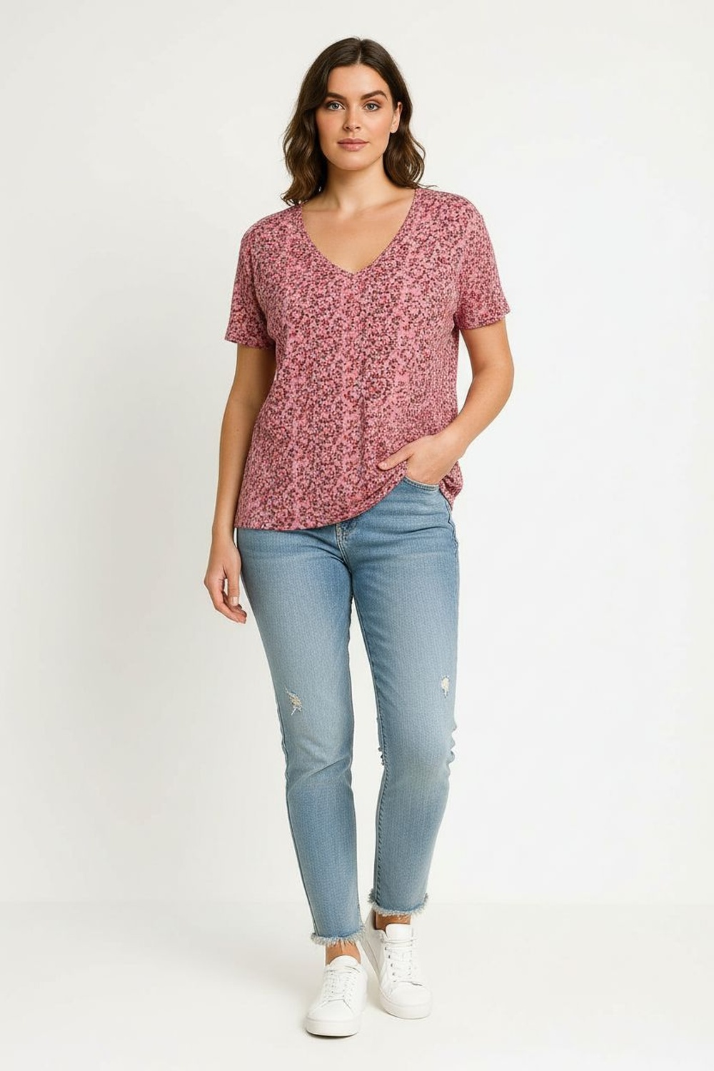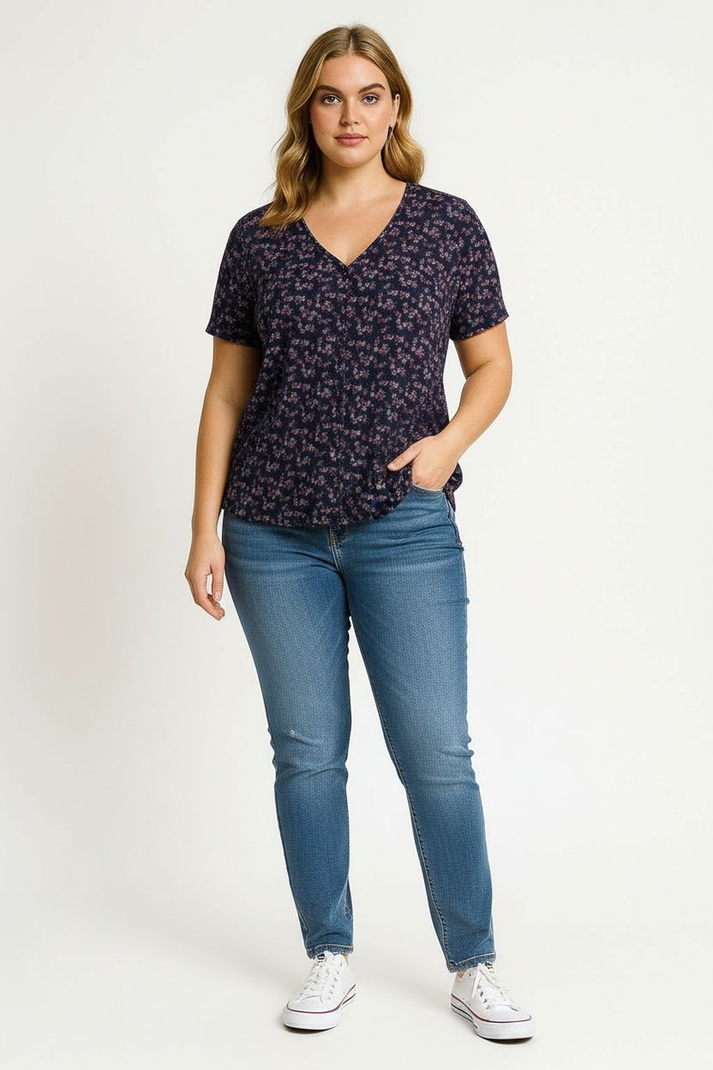 Playera de manga corta con escote en V que estiliza el cuello, botonadura frontal decorativa que realza el diseño, corte recto que favorece la silueta y aporta comodidad, confeccionada en tela rib ligera con textura acanalada que ofrece frescura y elasticidad, ideal para outfits casuales y combinaciones modernas de temporada