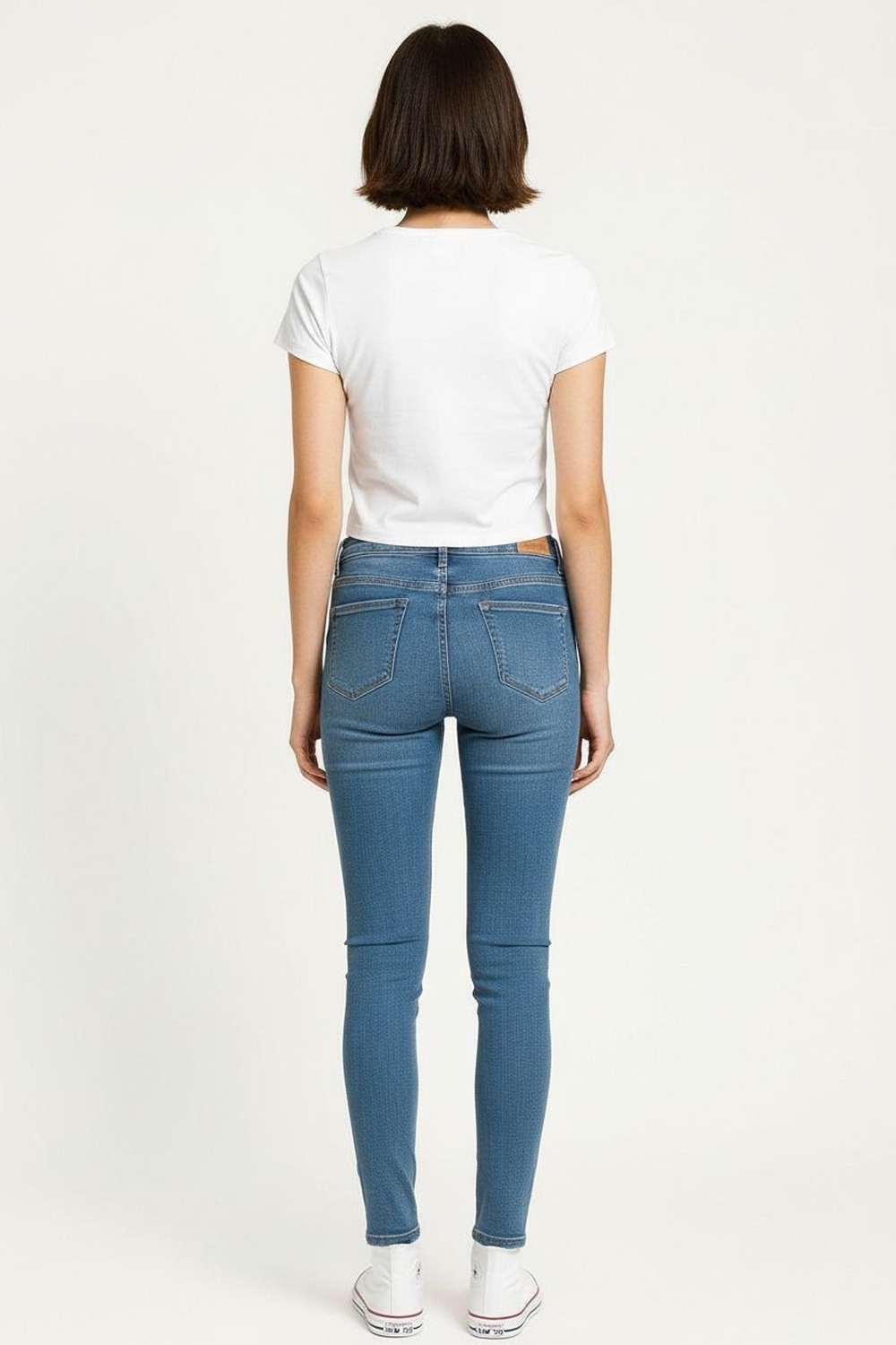 Chaleco de mezclilla con corte entallado que define la figura, cuello en V profundo con botonadura metálica al frente, detalles bordados que agregan textura artesanal, diseño con costuras visibles que aportan estructura y estilo urbano