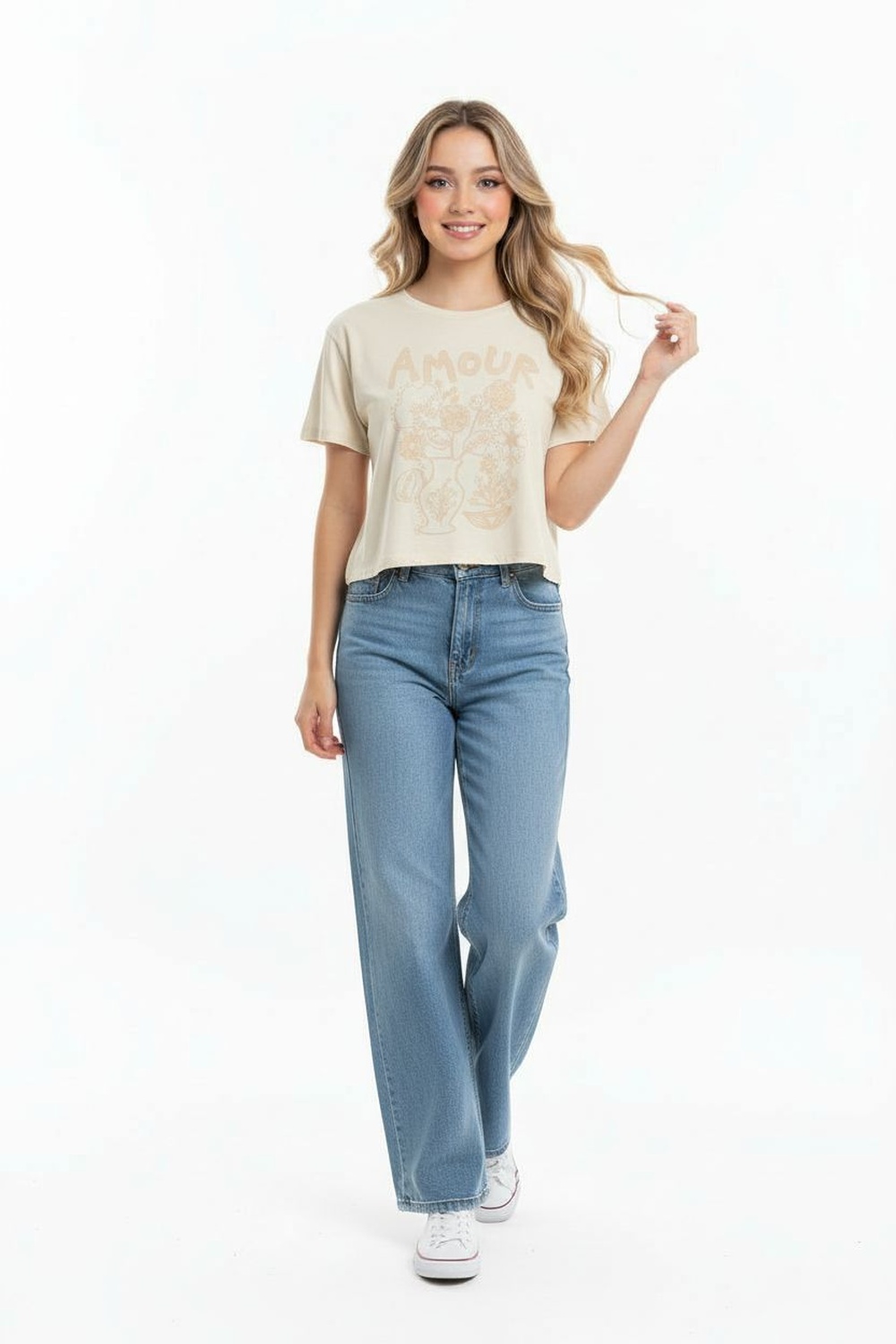 Playera de manga corta, cuello redondo, silueta recta, gráfico decorativo al frente, estructura ligera, acabado cómodo para uso diario