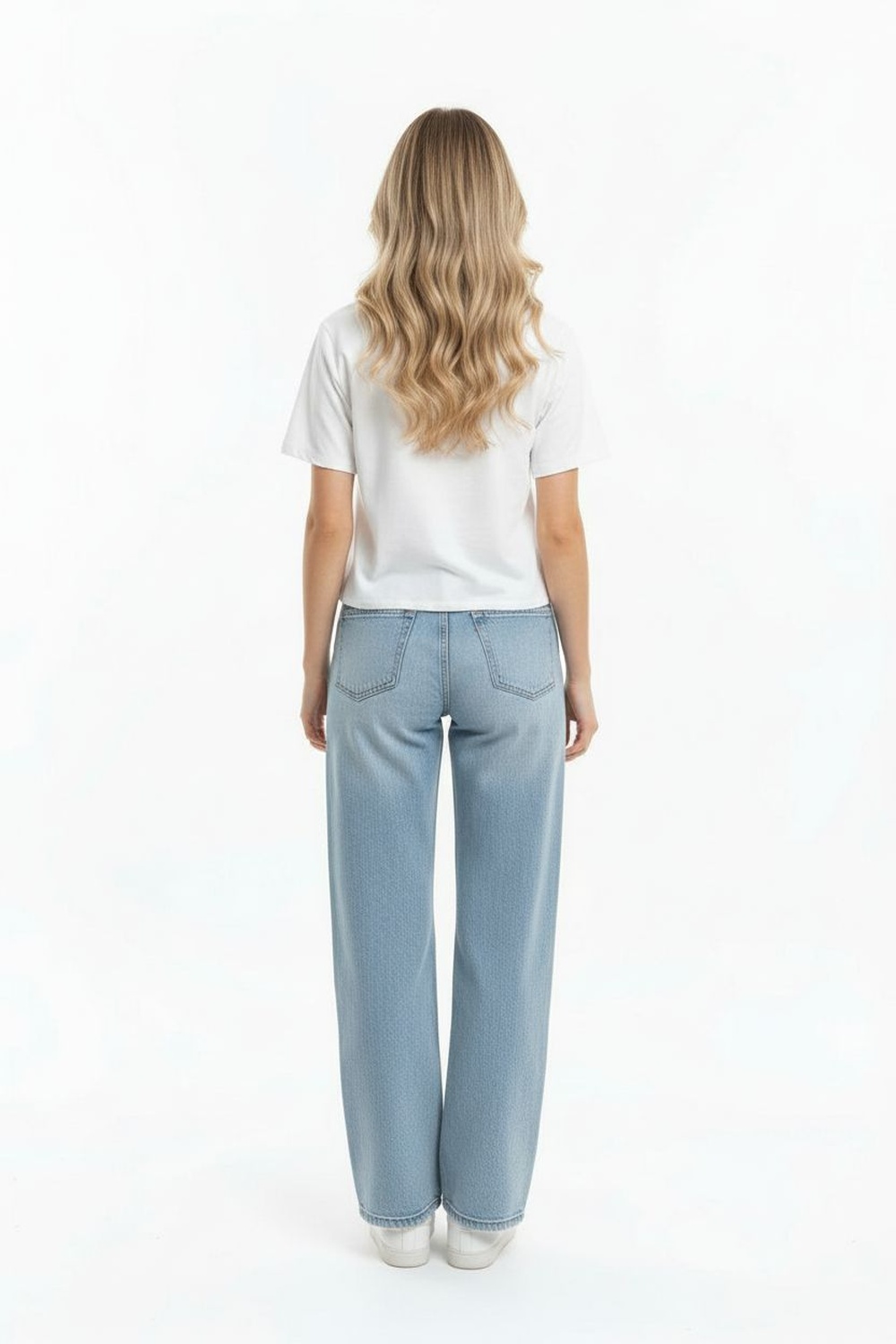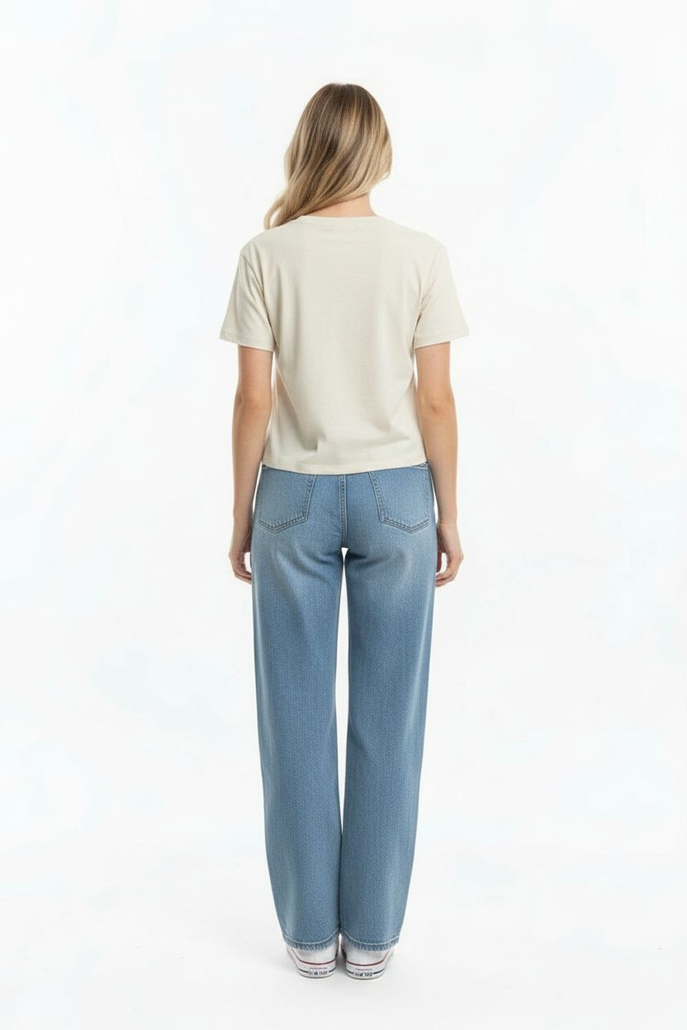 Jeans de pretina alta con cierre frontal de botones, trabillas funcionales, bolsillos delanteros y traseros, ajuste ceñido al cuerpo, estructura firme con terminados definidos