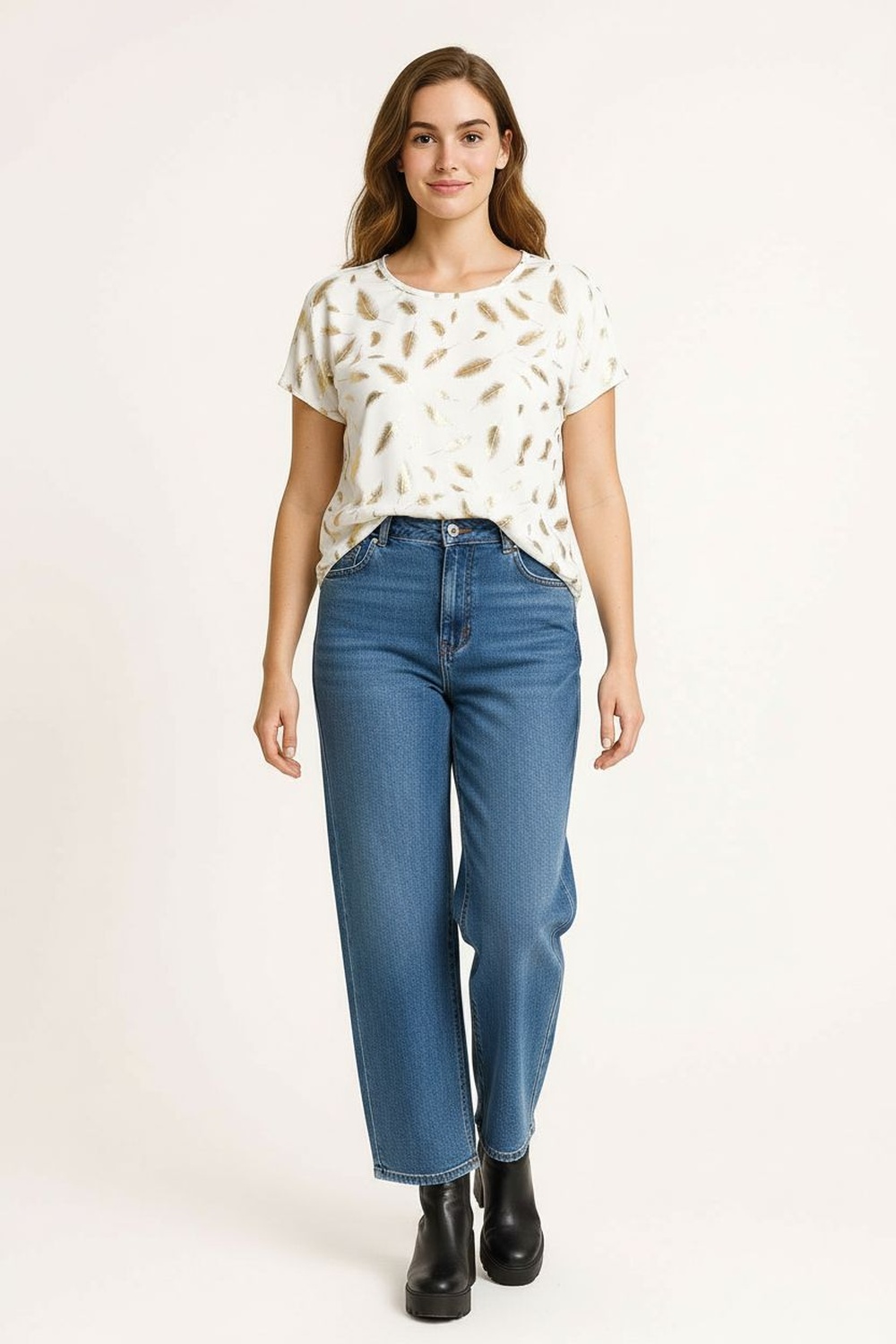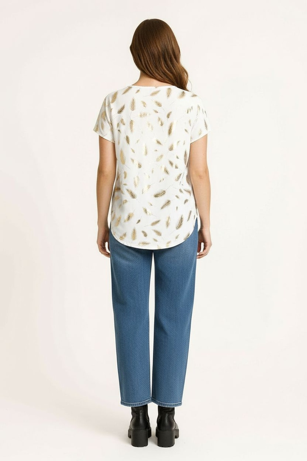 Playera de manga corta con escote redondo y corte recto que ofrece comodidad diaria, confección en tela ligera de tacto suave que se adapta al cuerpo, largo a la cadera que brinda cobertura adecuada, diseño integral que añade detalle visual atractivo para looks casuales