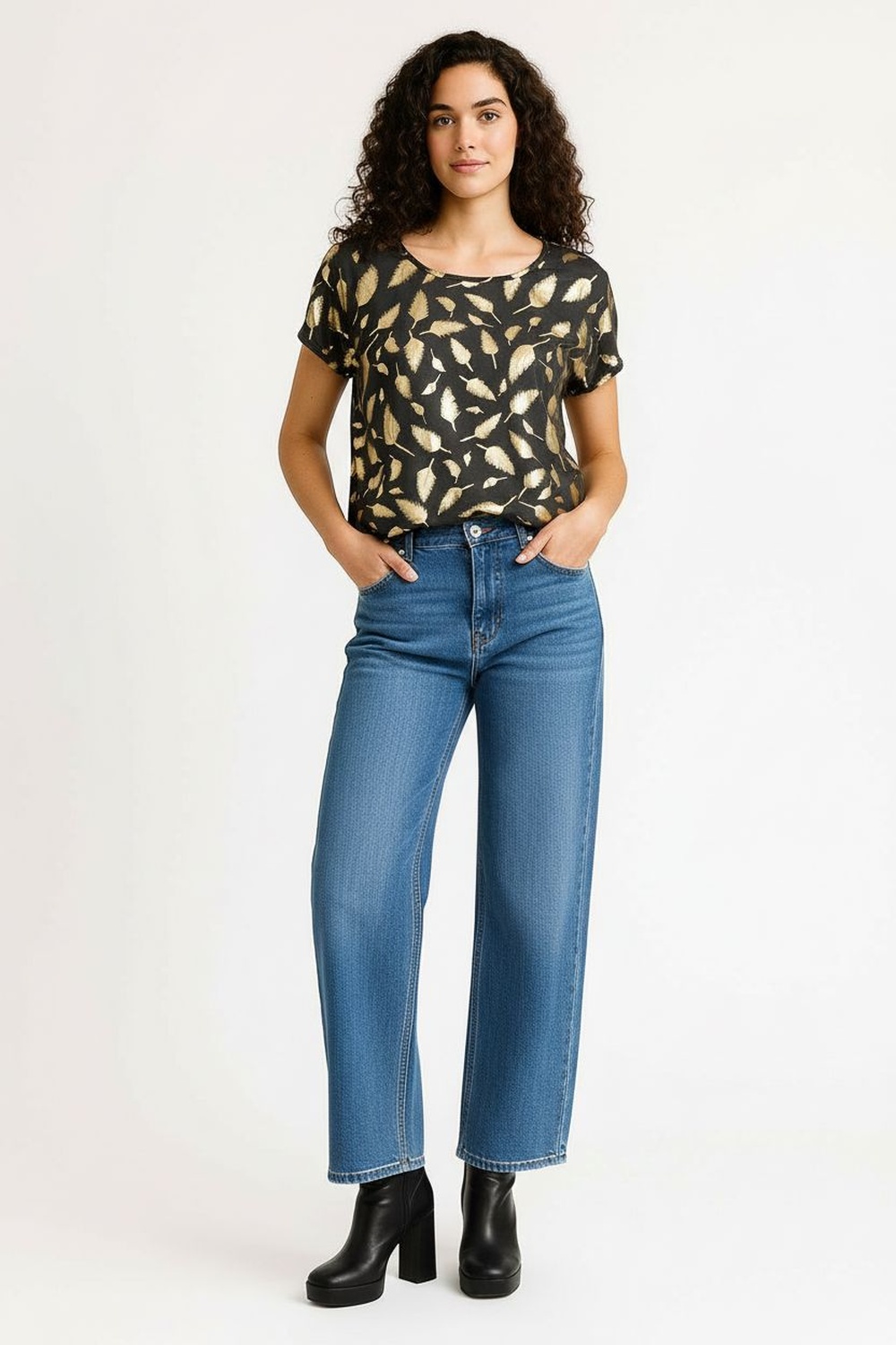 Playera de manga corta con pliegue superior que aporta volumen sutil, cuello redondo y detalle de collar decorativo incluido, confeccionada en tejido elástico con tacto suave y caída ligera para máxima comodidad