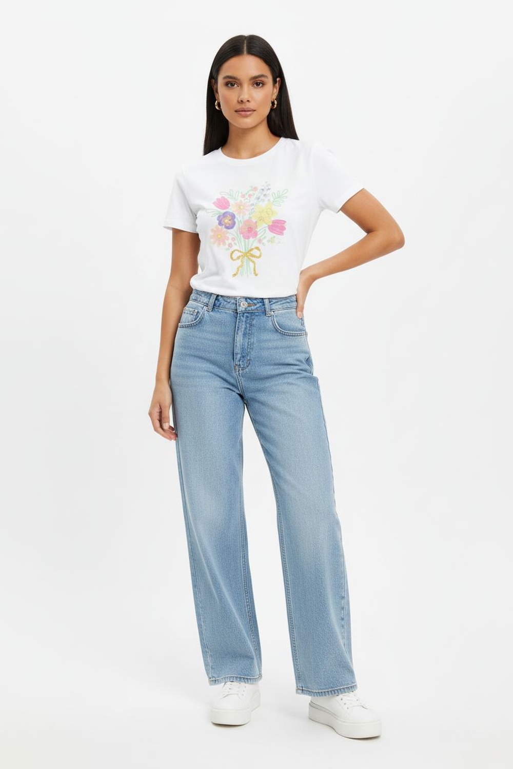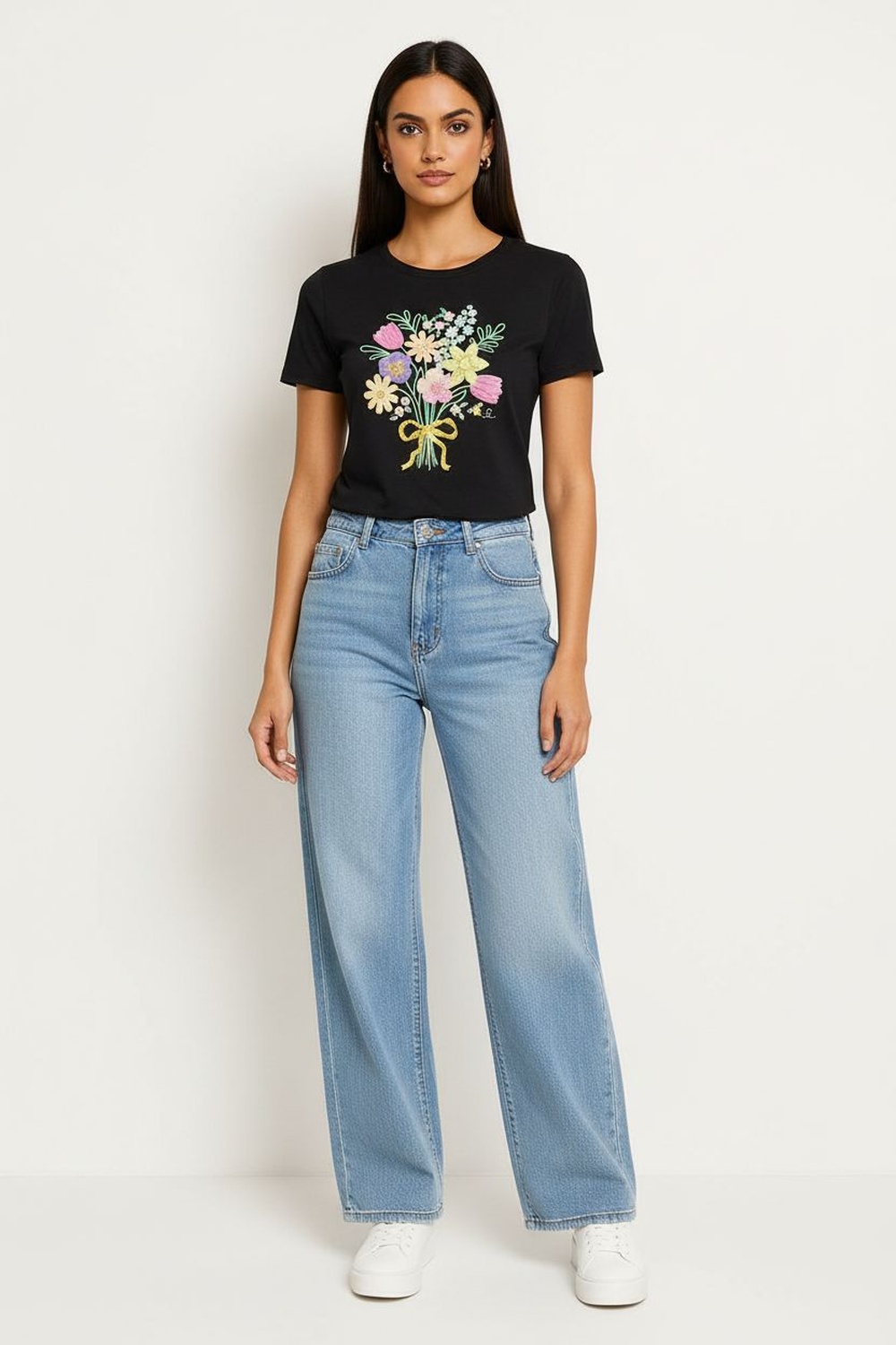 Playera de manga corta con corte clásico y ajuste cómodo, cuello redondo con acabado firme que conserva su estructura, tejido ligero y flexible que se adapta al cuerpo, diseño floral al frente con detalle bordado que aporta textura y relieve visual, confección pensada para brindar suavidad y frescura durante todo el día