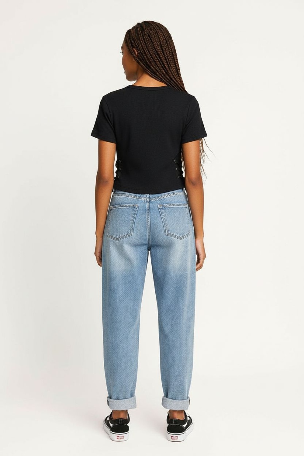 Jeans de tiro medio con corte amplio que brinda libertad de movimiento, bolsas laterales tipo cargo con tapa que aportan funcionalidad práctica, pretina con trabillas para asegurar distintos tipos de cinturón, pernera recta que estructura la caída del tejido, costura visible que refuerza cada panel, longitud completa que favorece distintas alturas