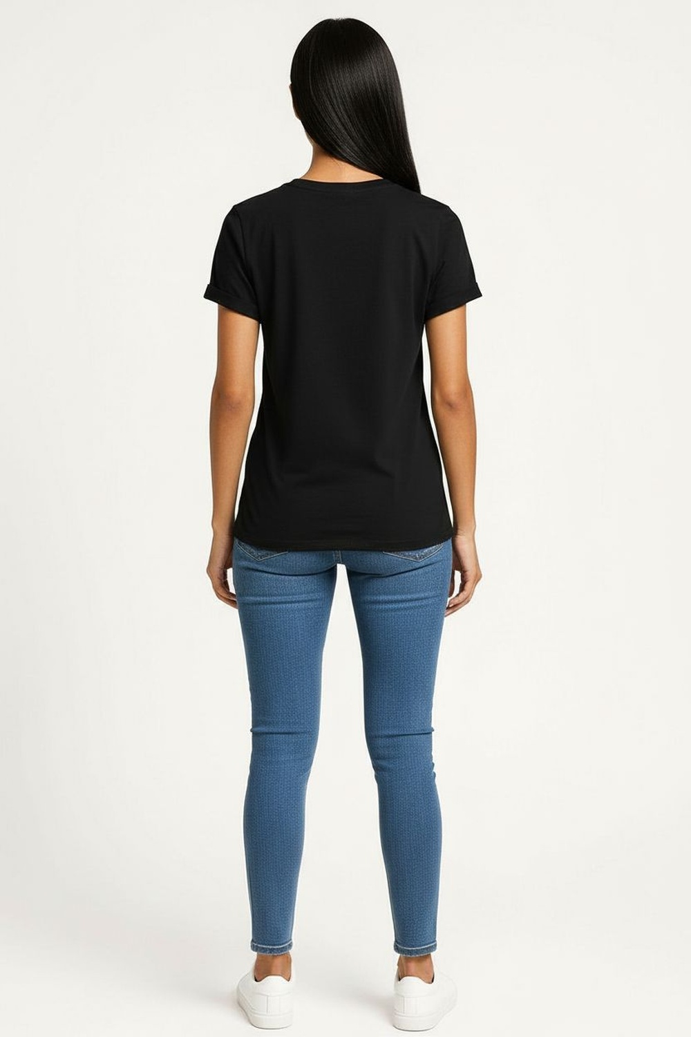 Playera tipo crop elaborada en tejido de algodón suave, manga corta con ajuste ligero al brazo, cuello redondo clásico que brinda comodidad, aplicación frontal decorativa integrada al diseño, largo corto que mantiene proporción equilibrada