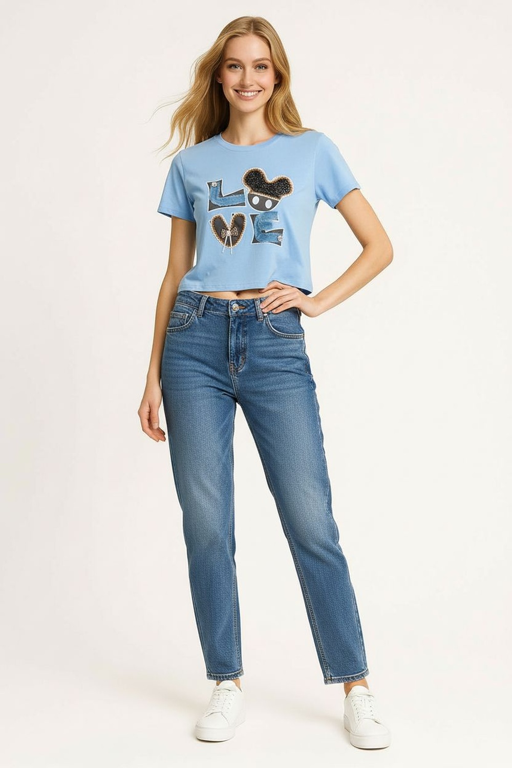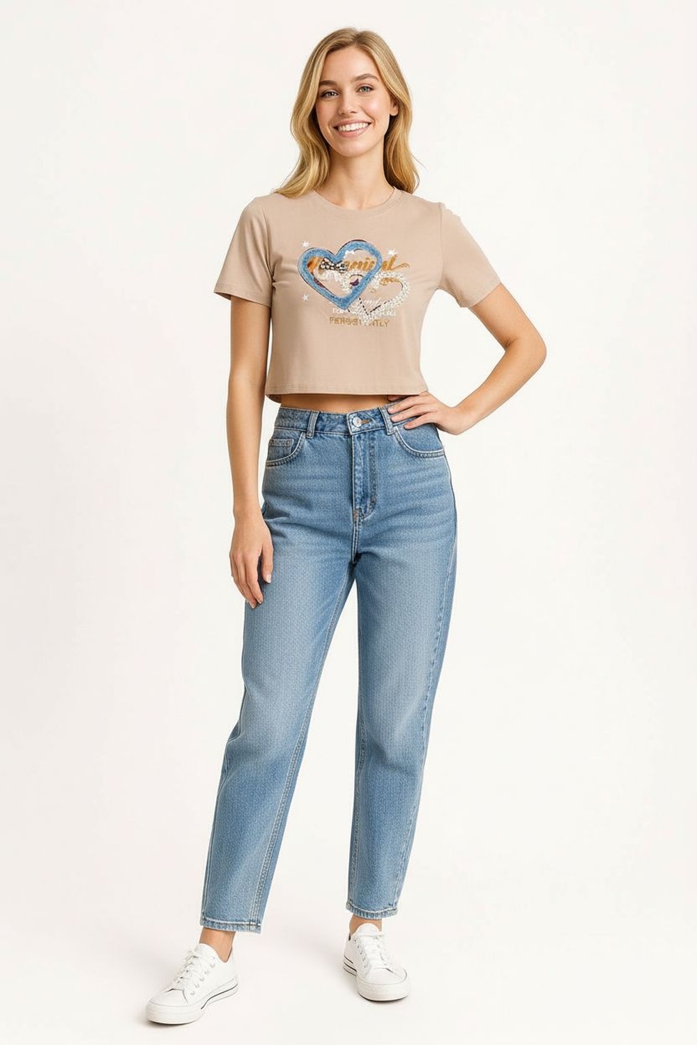 Playera de manga corta con cuello redondo, confeccionada en tejido suave, detalle decorativo al frente con aplicación textil que aporta realce visual, estructura cómoda con caída natural, costado recto que mantiene equilibrio en la silueta