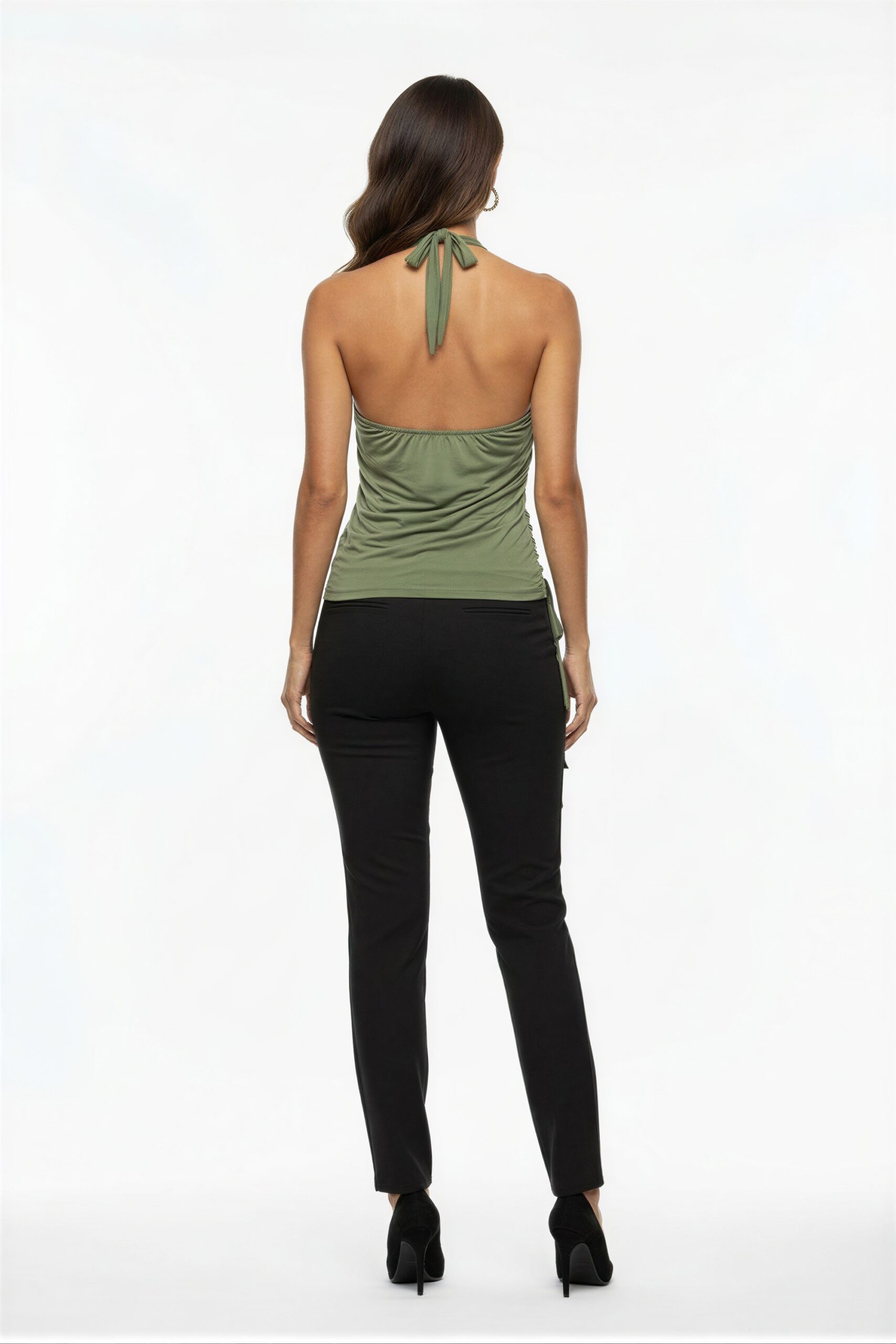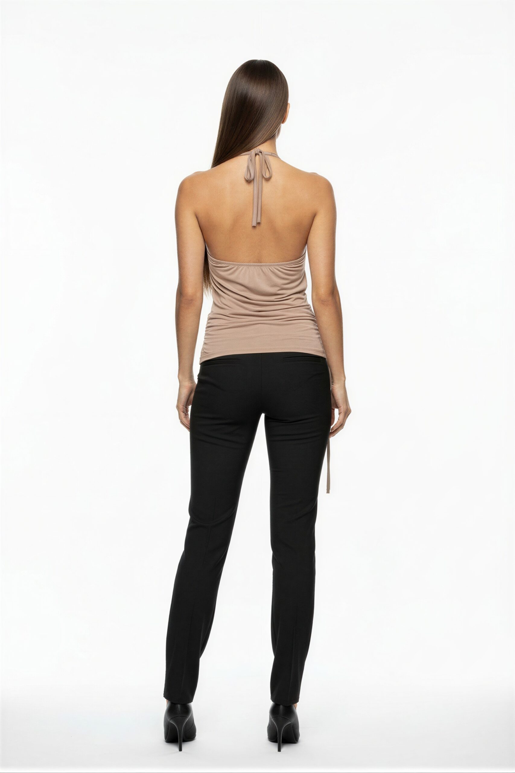 Playera tipo halter con escote drapeado ajuste lateral con lazo y espalda descubierta