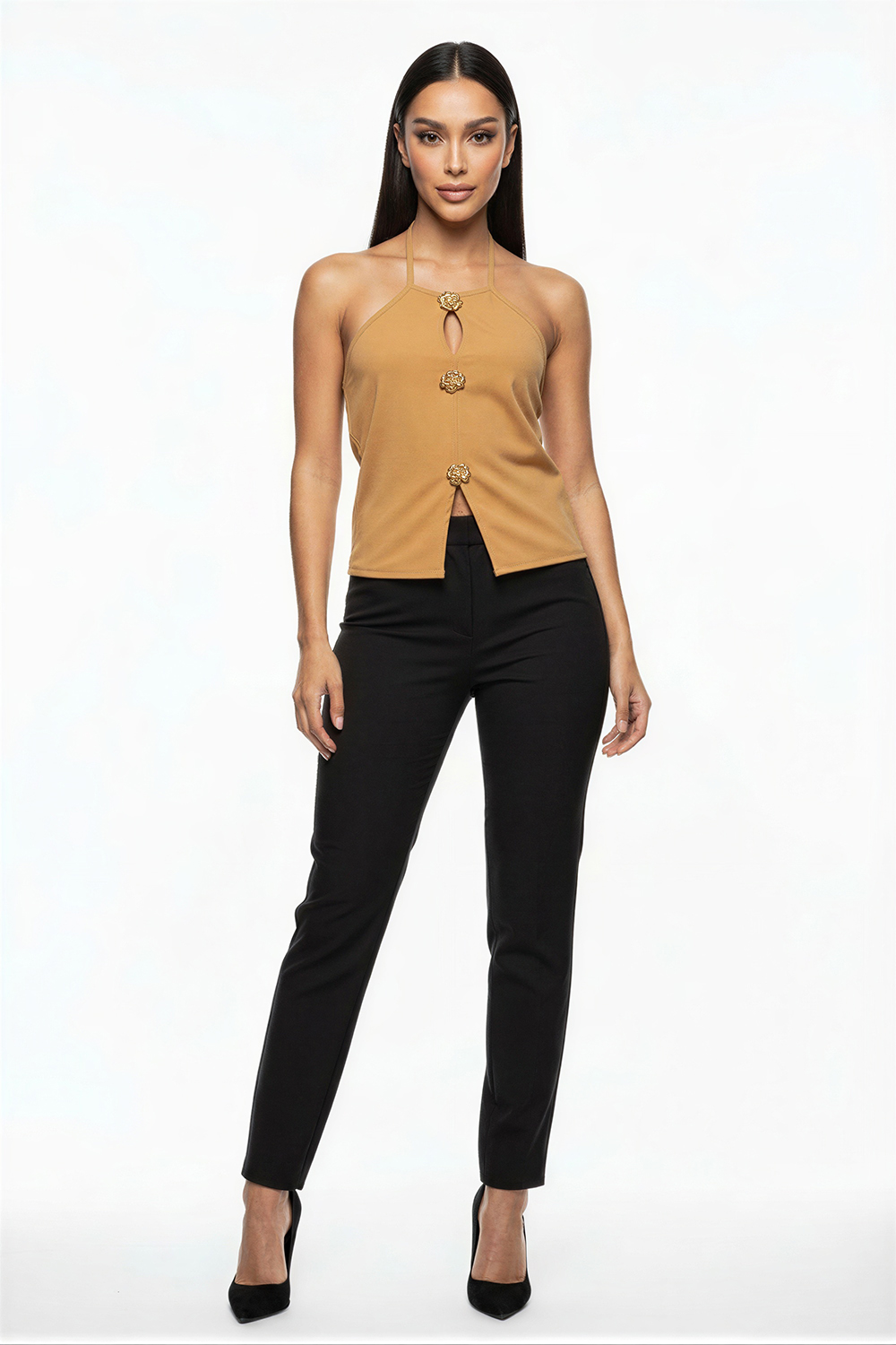 PLAYERA HALTER BOTONES DORADOS