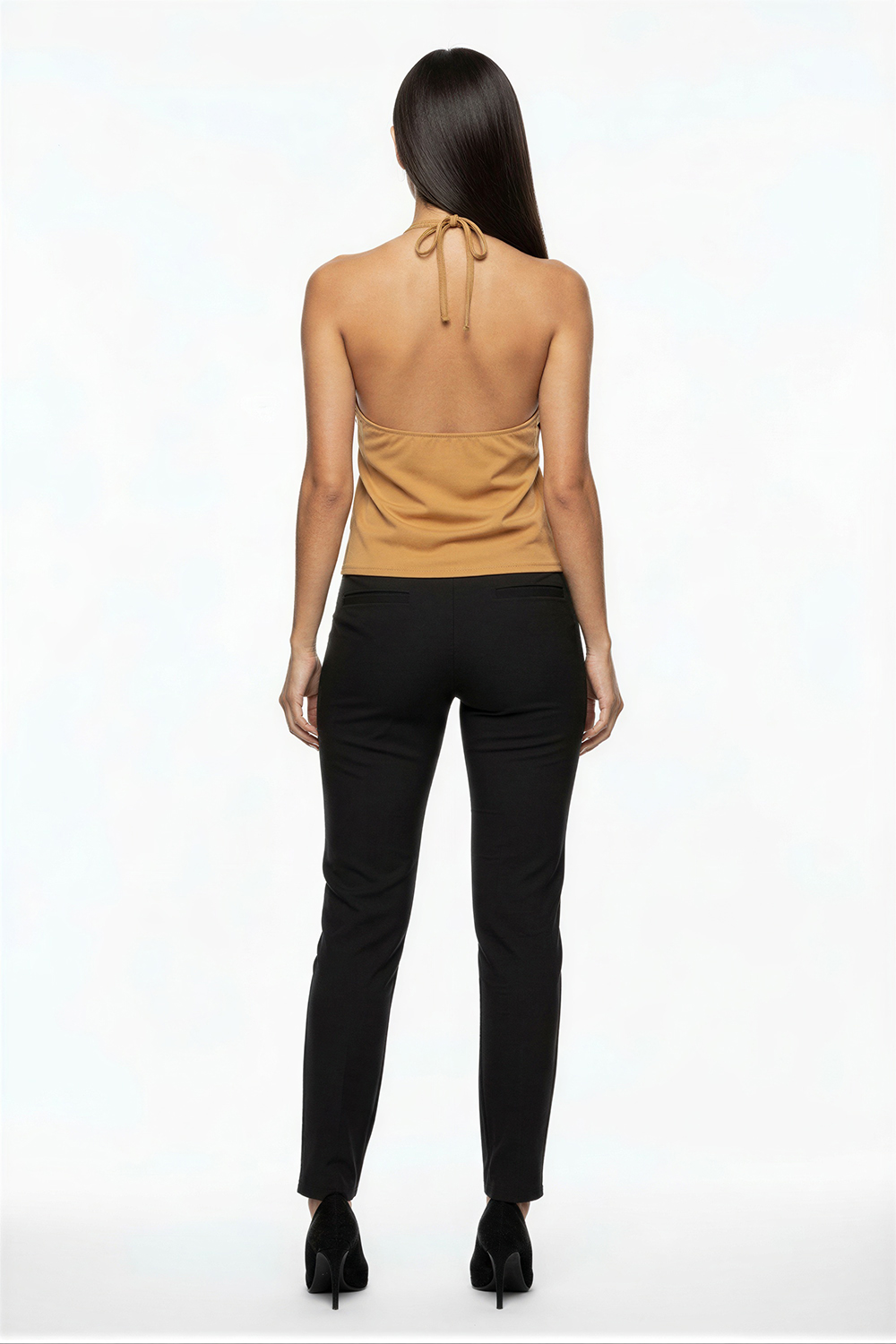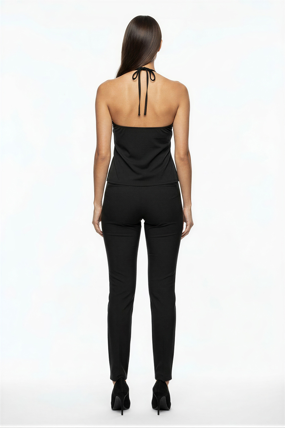 Playera tipo halter con escote alto y ajuste de jareta en cuello, diseño sin mangas que permite mayor frescura, botonadura frontal decorativa que aporta detalle distintivo, corte recto con ligera abertura inferior que facilita el movimiento, confección ligera con caída suave al cuerpo