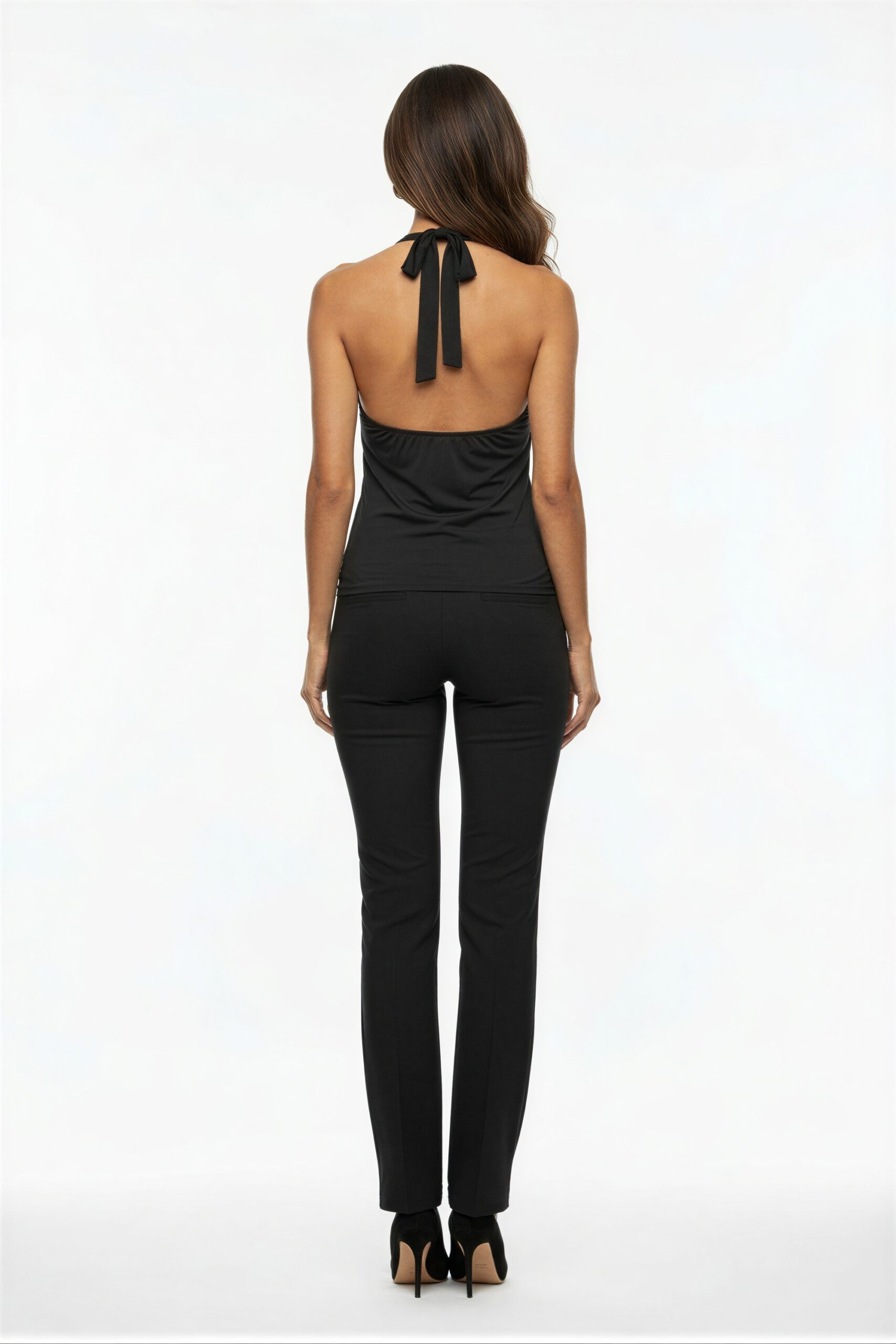 Playera tipo halter con escote pronunciado al frente fruncido en pecho espalda descubierta con amarre superior ajuste al cuerpo y caída suave