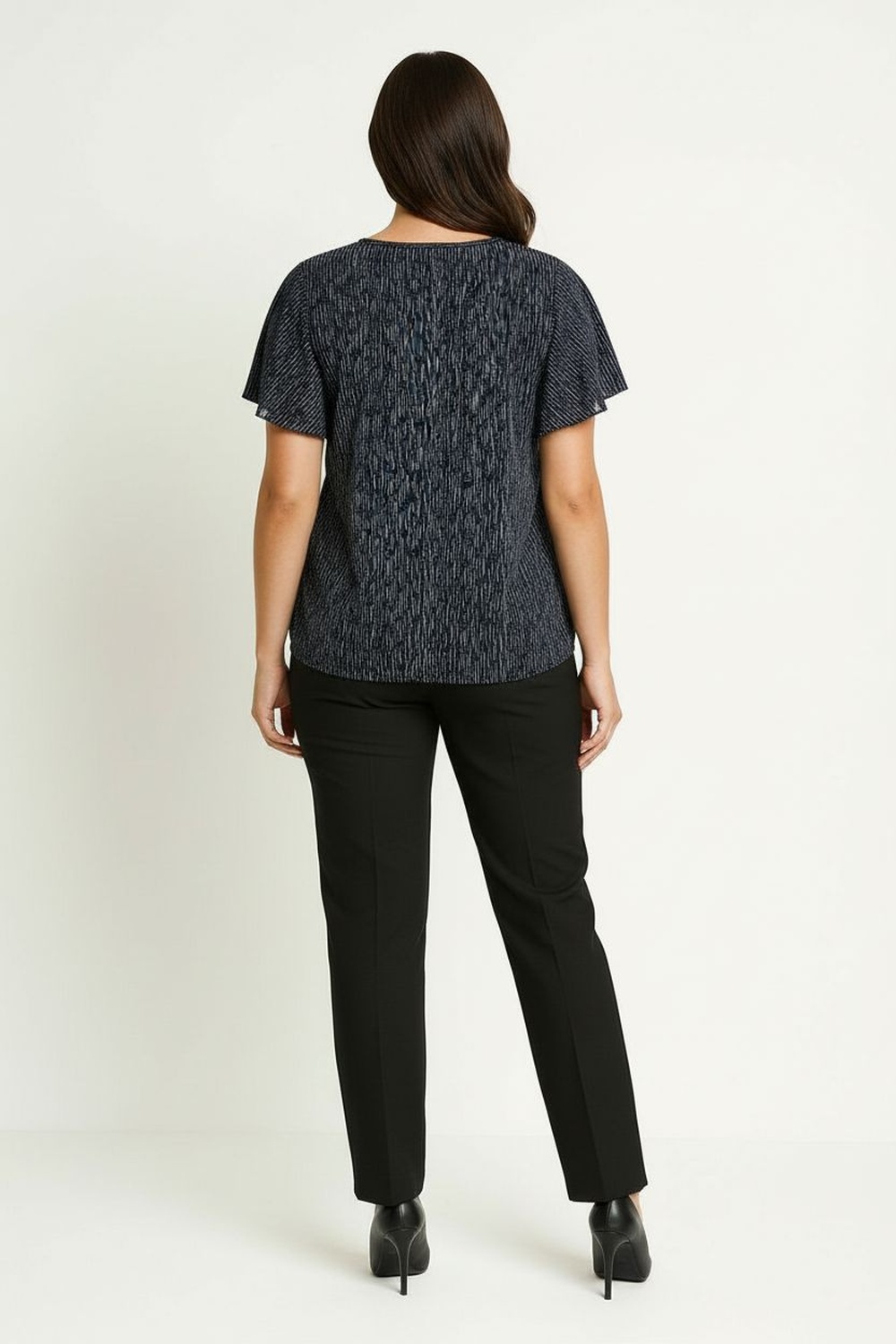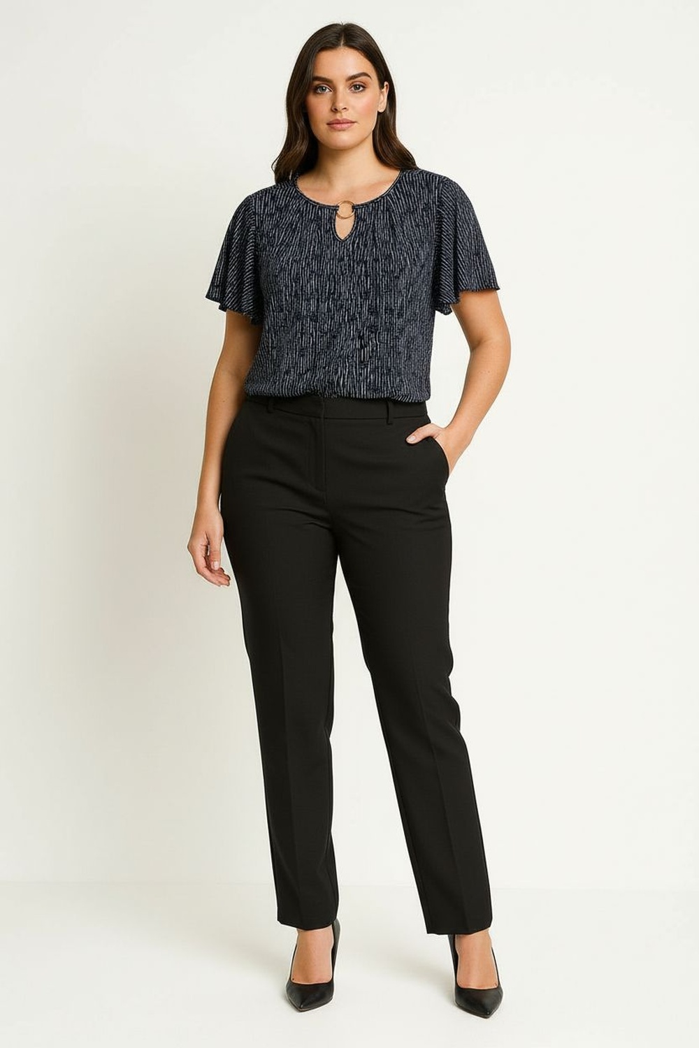 Playera de manga corta con silueta amplia que brinda frescura y comodidad, escote redondo con abertura central y aro metálico decorativo que aporta un detalle moderno, confección en tejido ligero que favorece la caída natural, ideal para outfits casuales y combinaciones versátiles de temporada