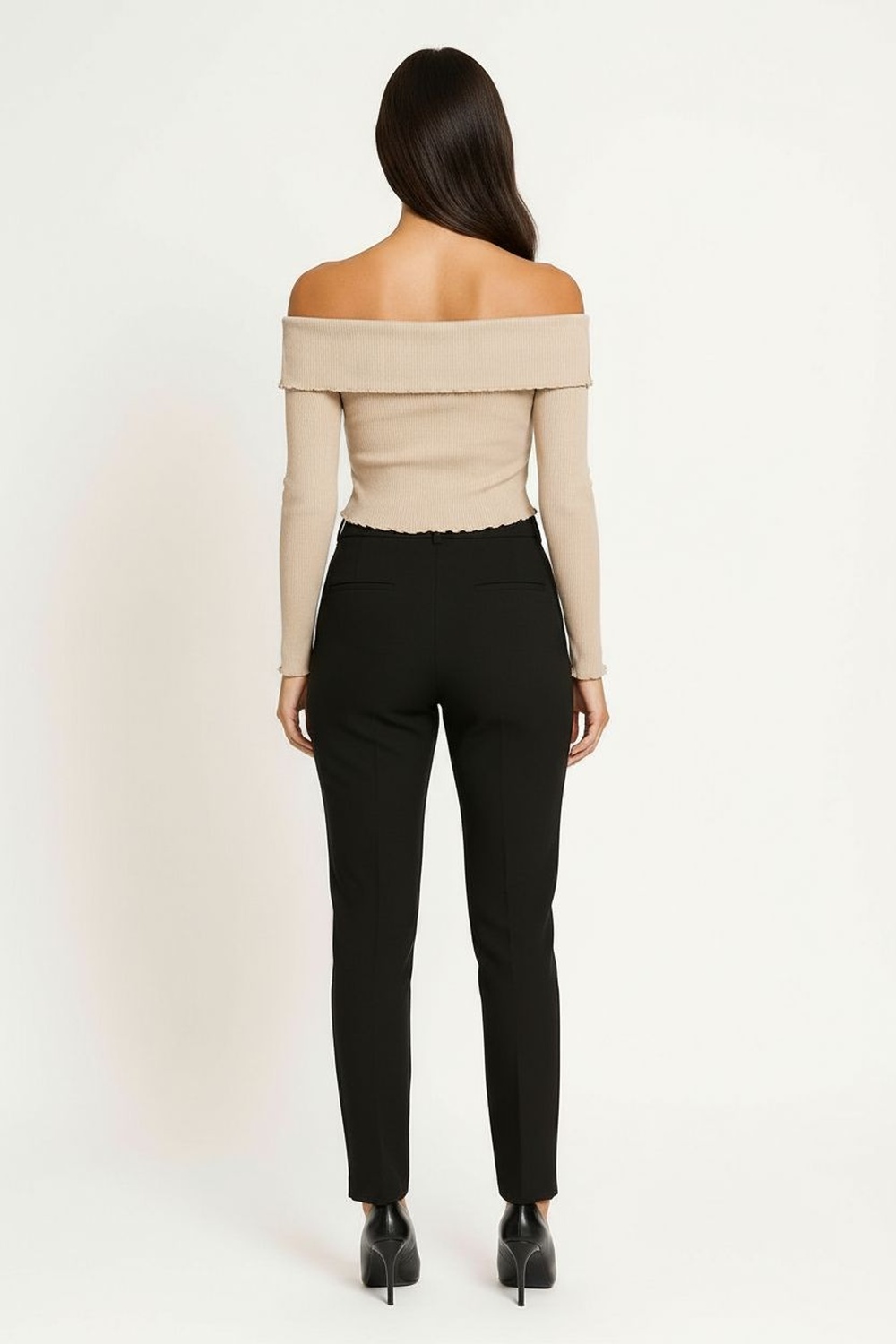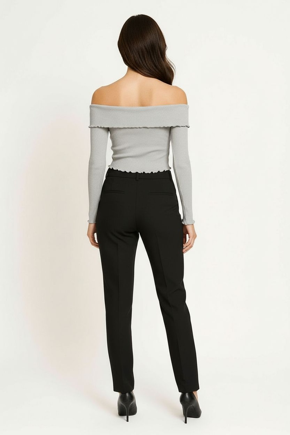 Playera con escote tipo bandeau que deja los hombros al descubierto, detalle de vuelo superior que aporta volumen y movimiento, confección en tejido acanalado con elasticidad que se ajusta suavemente al cuerpo