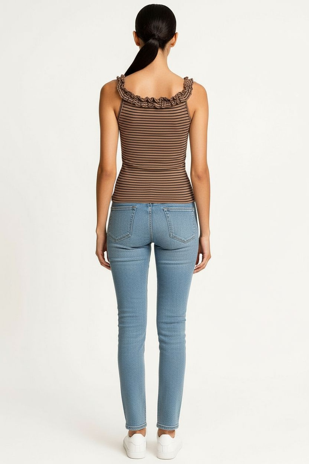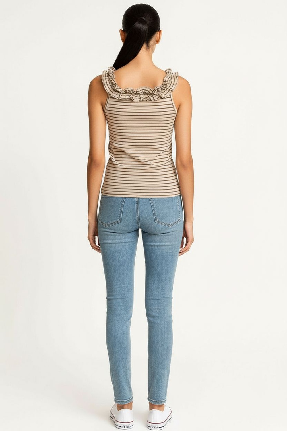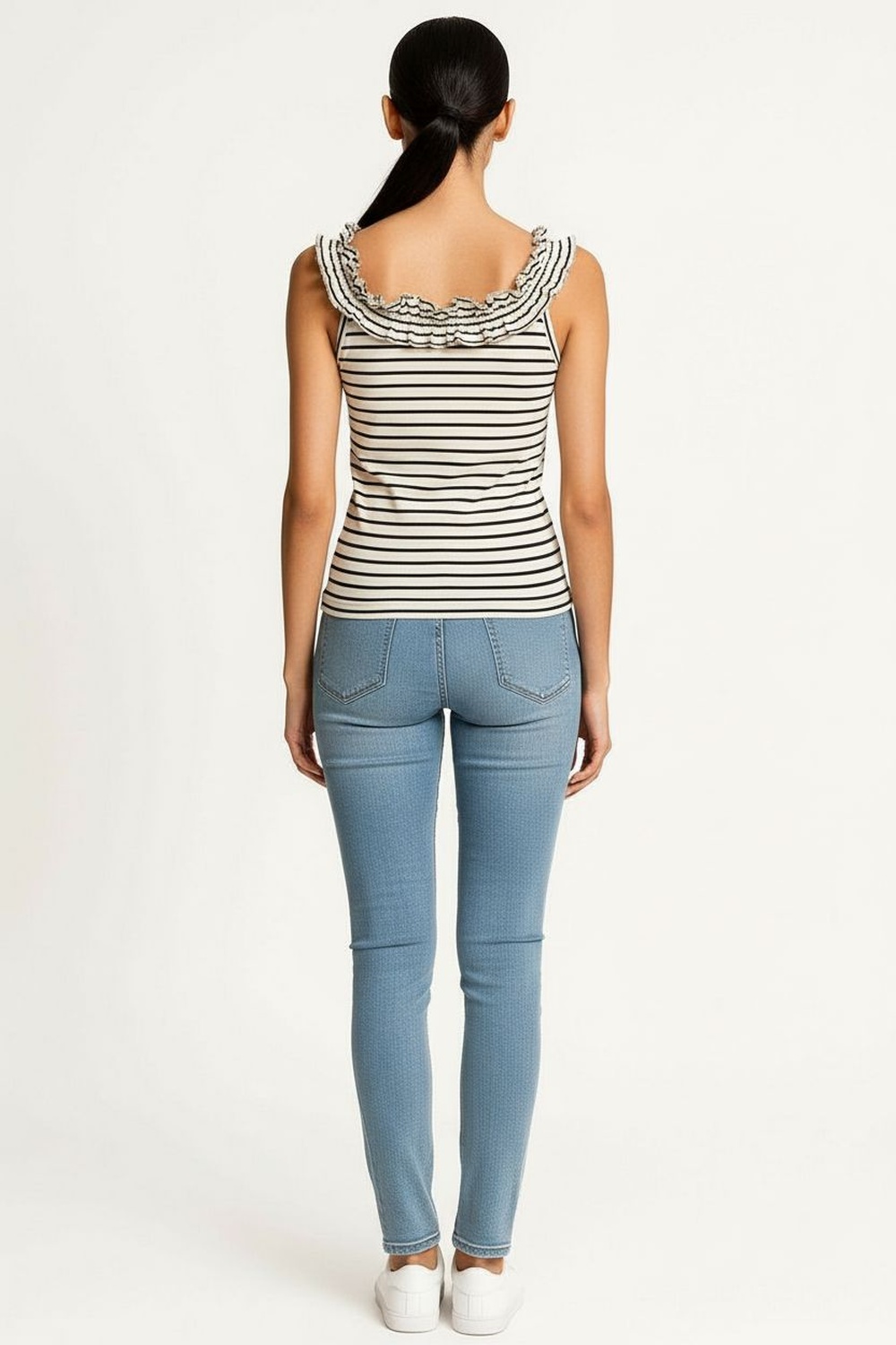 Top con tirantes delgados, escote recto, diseño de doble capa en parte frontal, estructura ligera, caída suave, acabado limpio