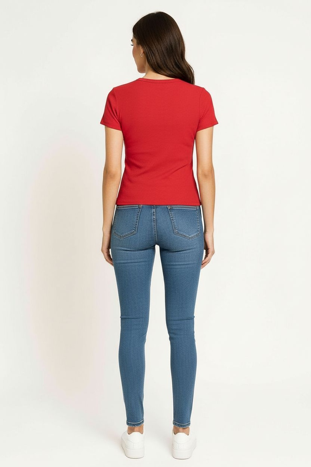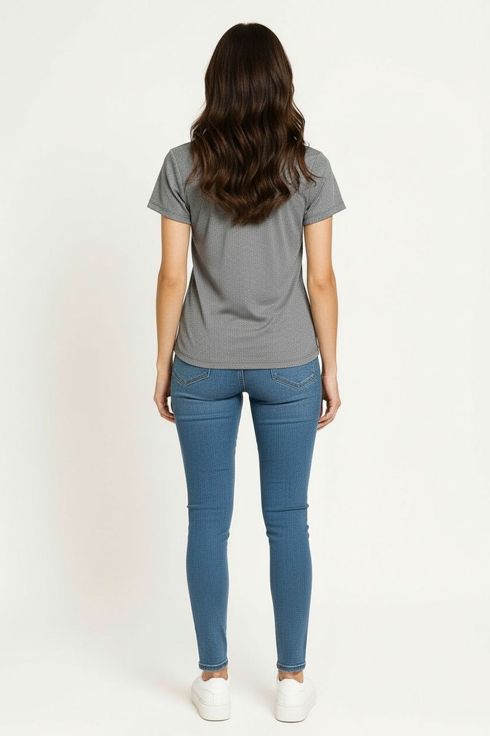 Playera de corte recto con cuello redondo combinado que aporta un toque moderno y estructurado, mangas a medio brazo que brindan comodidad y cobertura equilibrada, confección en tejido suave de textura lisa que se ajusta al cuerpo con naturalidad, diseño versátil que realza la silueta sin perder comodidad durante el uso diario