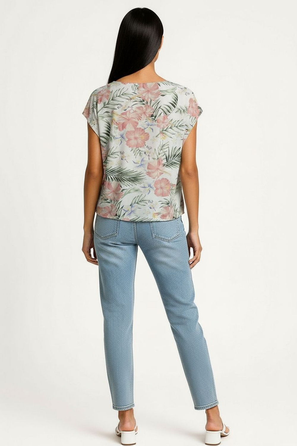 Blusa de manga corta con diseño de capas en la manga y cuello redondo, confección en tejido ligero con textura suave que aporta frescura, corte recto con caída natural al cuerpo, abertura posterior con botón que facilita la colocación, terminaciones delicadas en mangas y bajo
