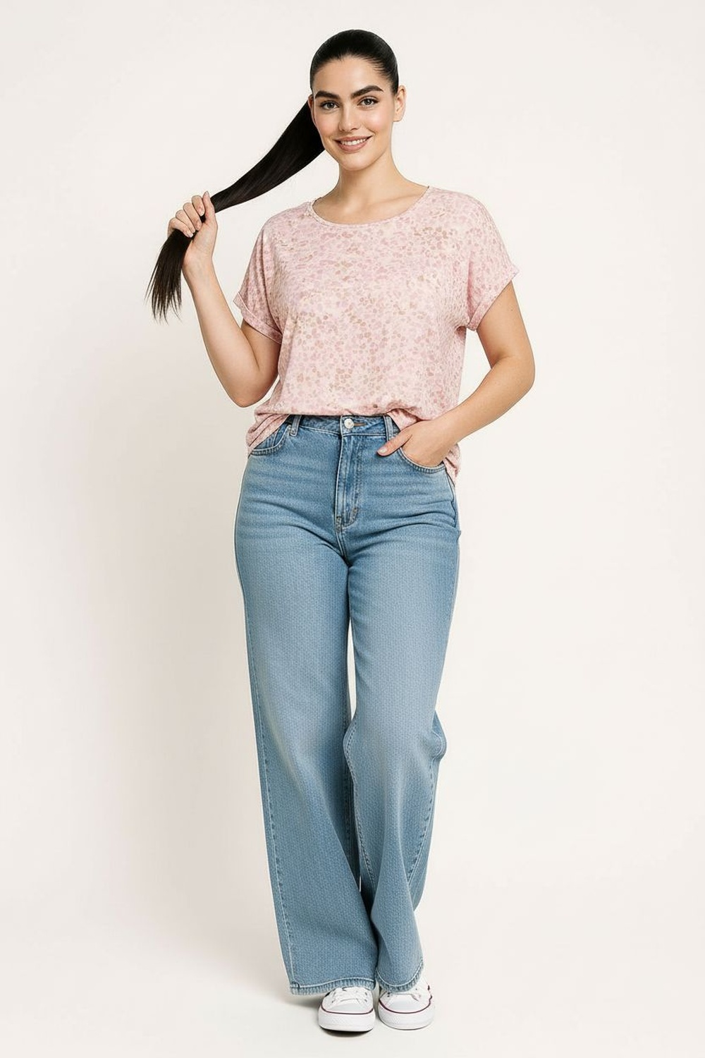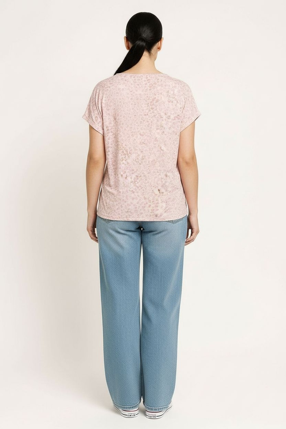Playera de manga corta con escote redondo de acabado limpio que brinda ajuste cómodo, aplicación tipo foil distribuida en toda la prenda que aporta brillo sutil y detalle llamativo, corte recto que permite movimiento natural, largo a la cadera que facilita su uso diario, confección en tela suave y flexible con sensación ligera al vestir
