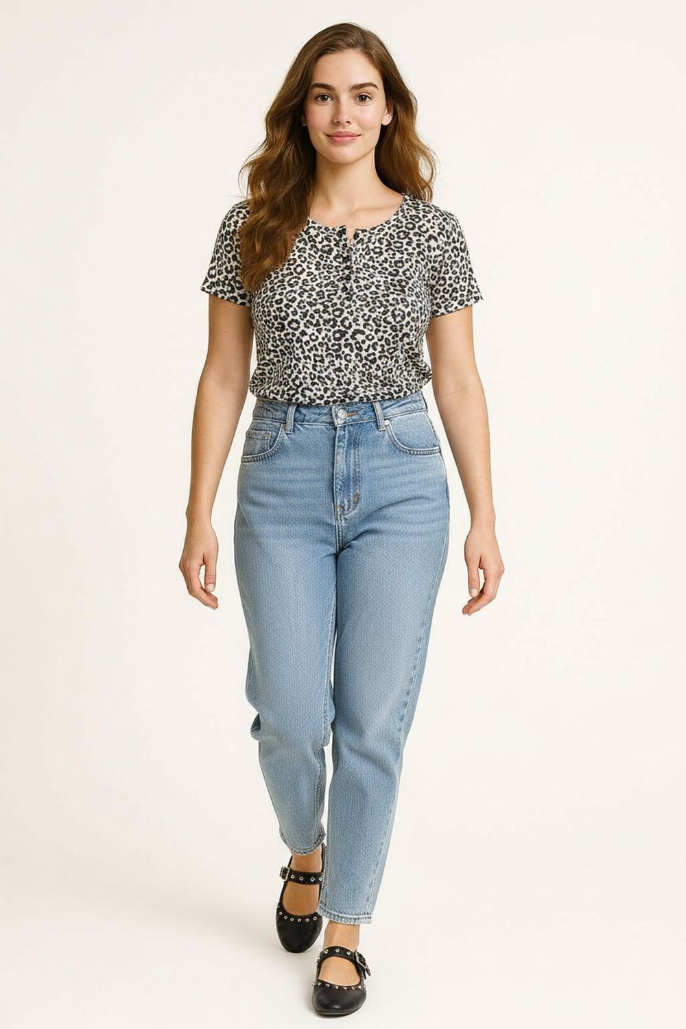 Playera holgada de silueta relajada con estampado animal en tonos neutros, cuello redondo fruncido con pequeña abertura al centro, manga corta estilo murciélago, ligera y versátil para un look casual
