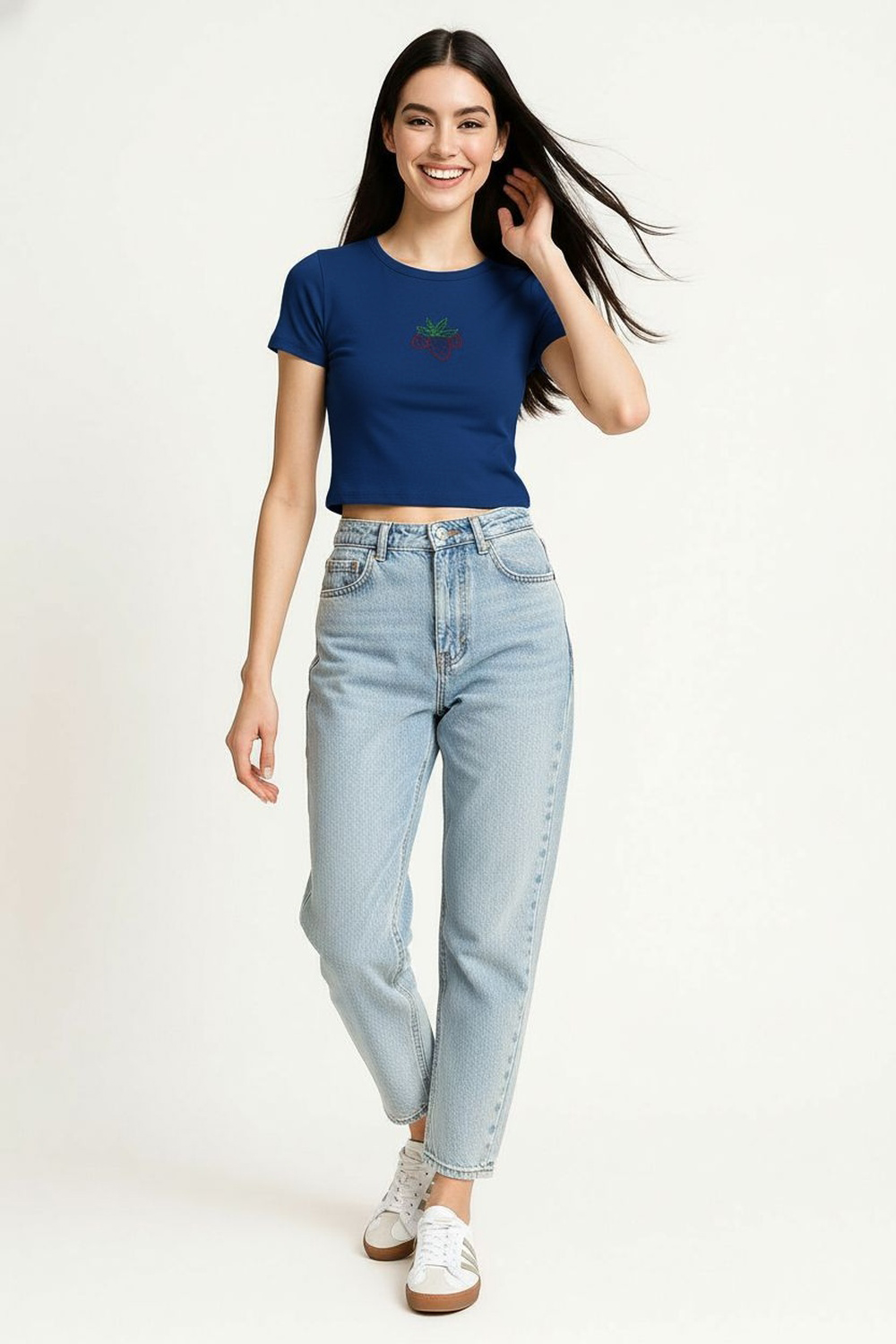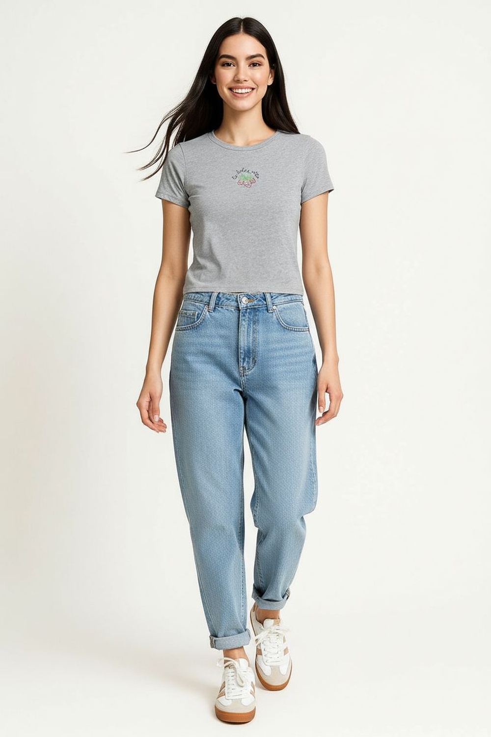 Playera de manga corta con cuello redondo, confeccionada en tejido de punto suave con elasticidad ligera, detalle de bordado al frente con motivo gráfico, terminaciones limpias en cuello y mangas que aportan un acabado prolijo