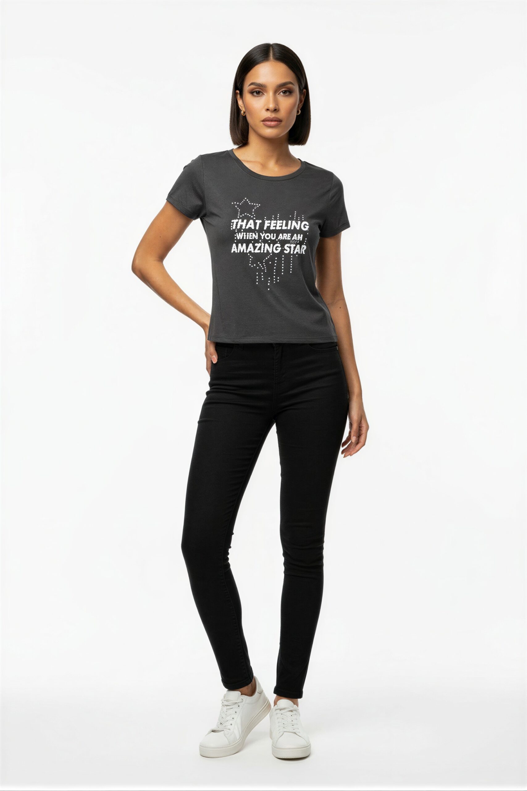 Playera de manga corta con cuello redondo, aplicación decorativa al frente con elementos brillantes, corte recto y ajuste cómodo para uso continuo