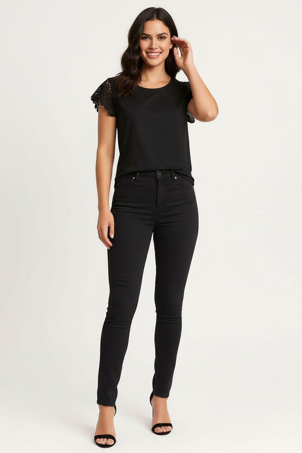 Playera cuello redondo con abertura frontal y detalle metálico, manga corta de ajuste cómodo, estructura ligera de confección suave, terminación recta inferior