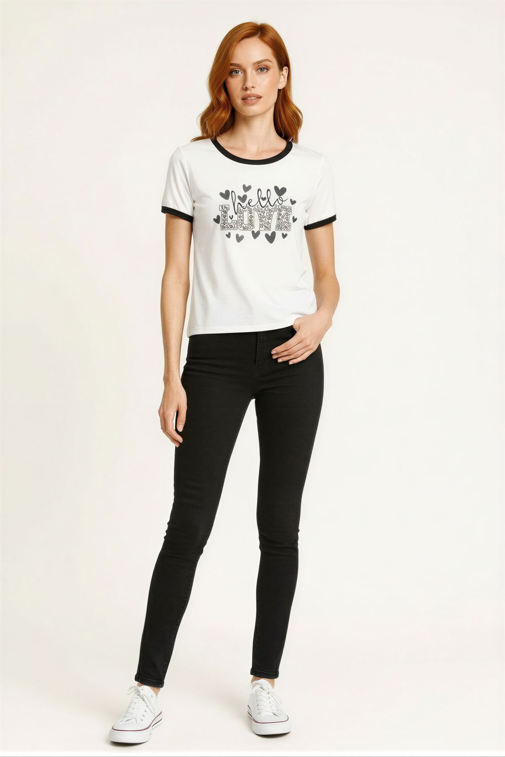 Playera de manga corta con cuello redondo, aplicación de letras al frente con detalles decorativos, estructura cómoda de ajuste regular