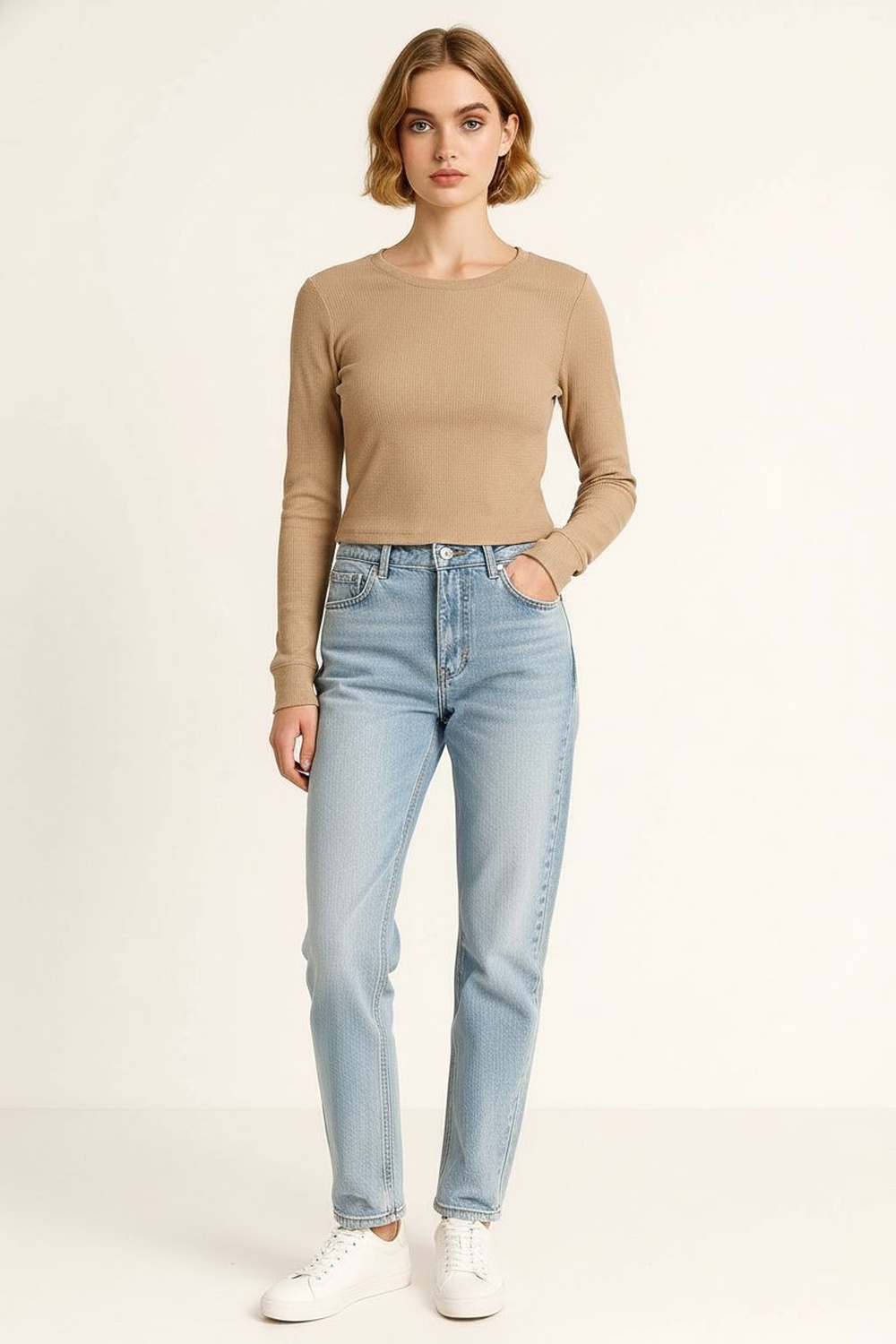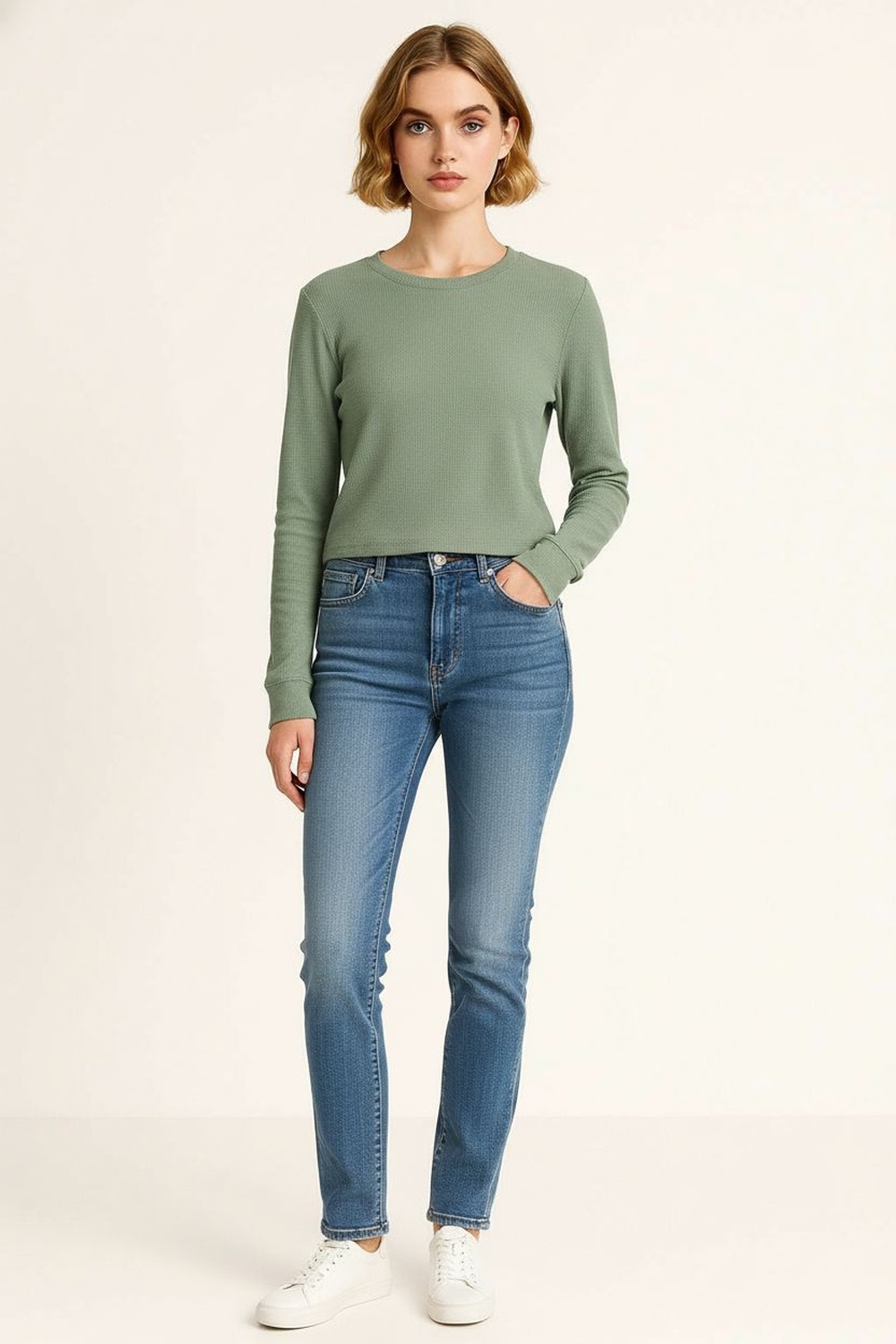Playera manga larga con textura tipo waffle que aporta comodidad y estilo, cuello redondo que define la parte superior, diseño crop con terminado recto que realza la cintura, puños ajustados que brindan un calce moderno, confeccionada en tejido suave y elástico que permite libertad de movimiento