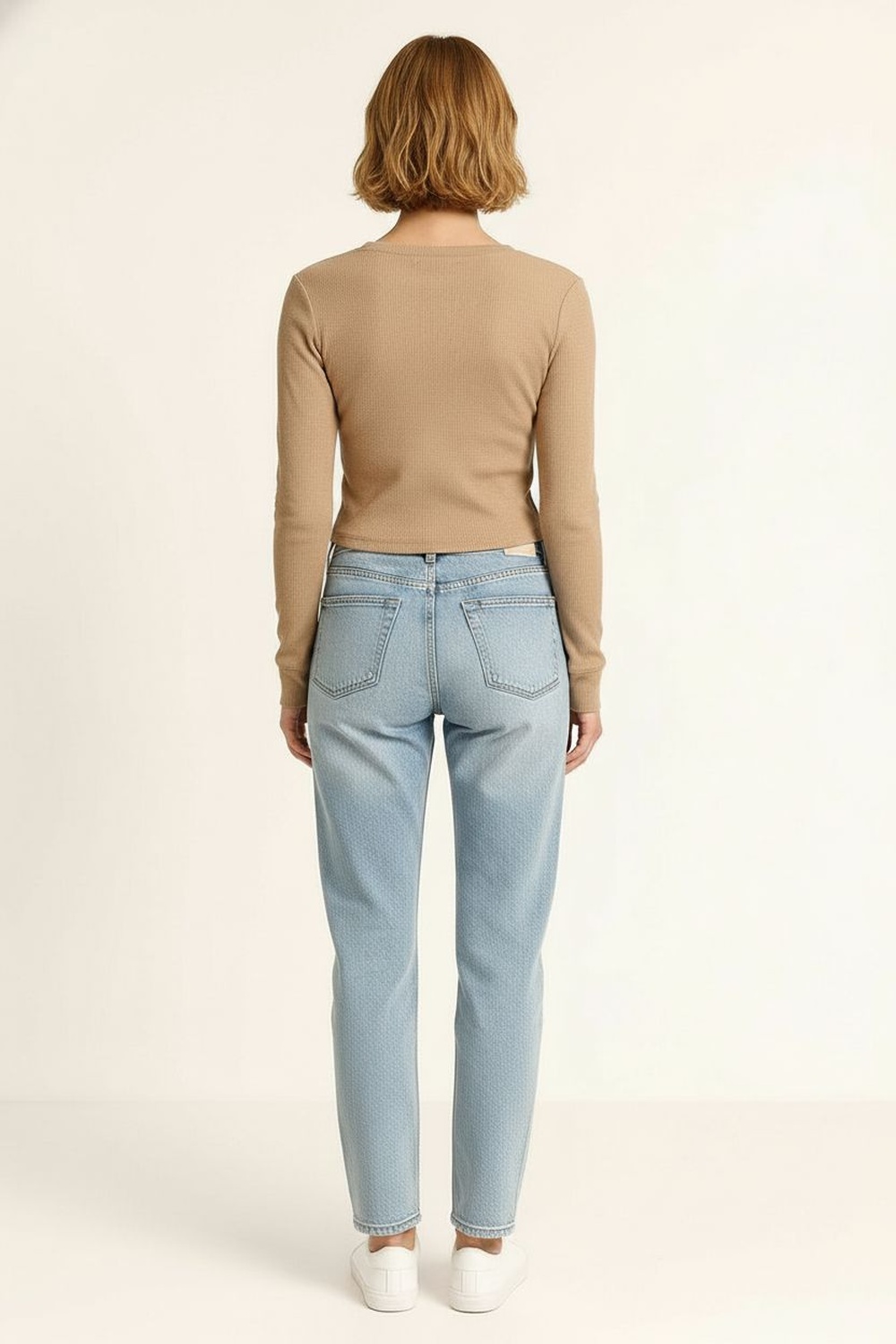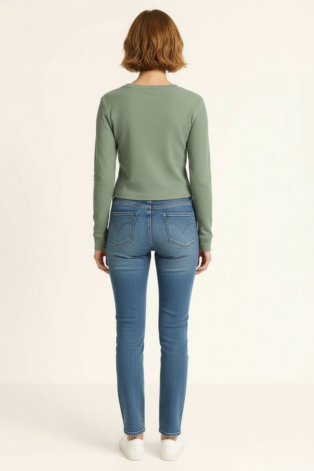 Playera de manga larga con diseño acanalado que realza la silueta, escote tipo ojal que aporta un toque moderno, botones frontales decorativos que añaden detalle visual, confección en tejido suave y elástico que brinda comodidad durante el día