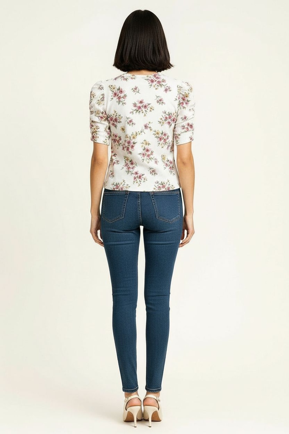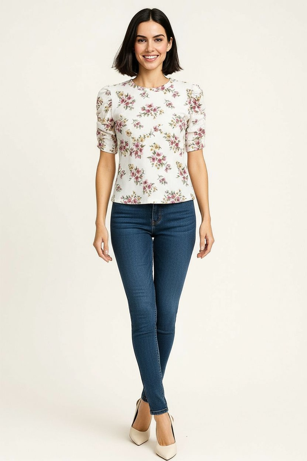 Playera de manga corta con pliegues marcados que aportan volumen y estructura al hombro, cuello redondo con acabado limpio, tejido suave con textura acanalada que se adapta al cuerpo, dobladillo recto que proporciona caída natural y aspecto pulido
