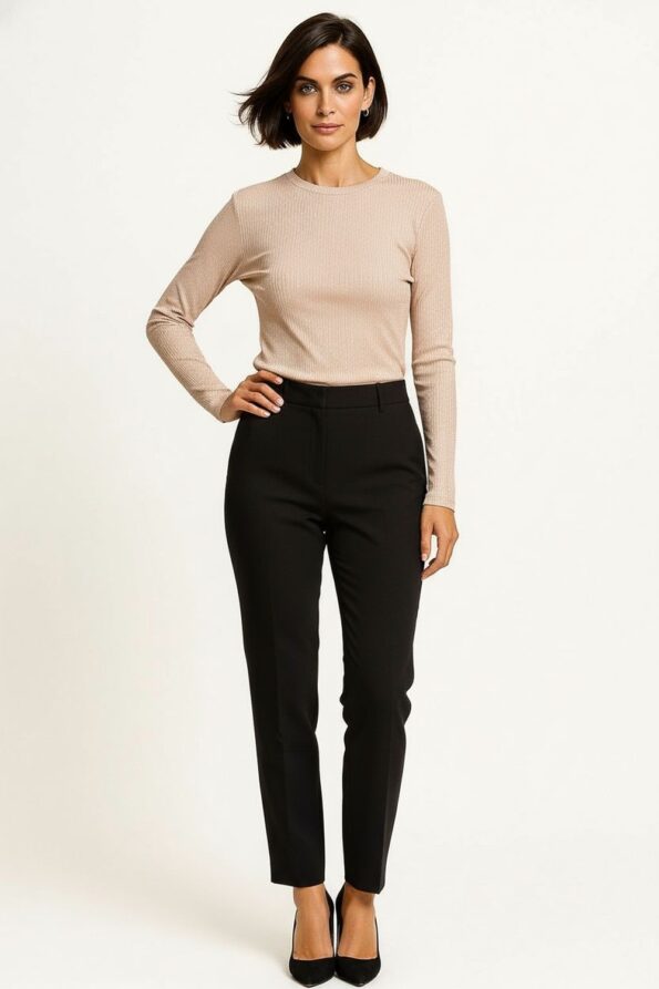 Playera confeccionada en tejido rib velour con acabado suave y textura acanalada, cuello redondo alto con terminación limpia que aporta estructura, mangas largas que brindan cobertura y confort, silueta ajustada que resalta la figura, confección en material elástico que favorece la movilidad y el buen calce