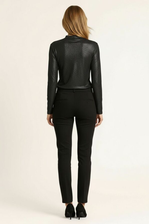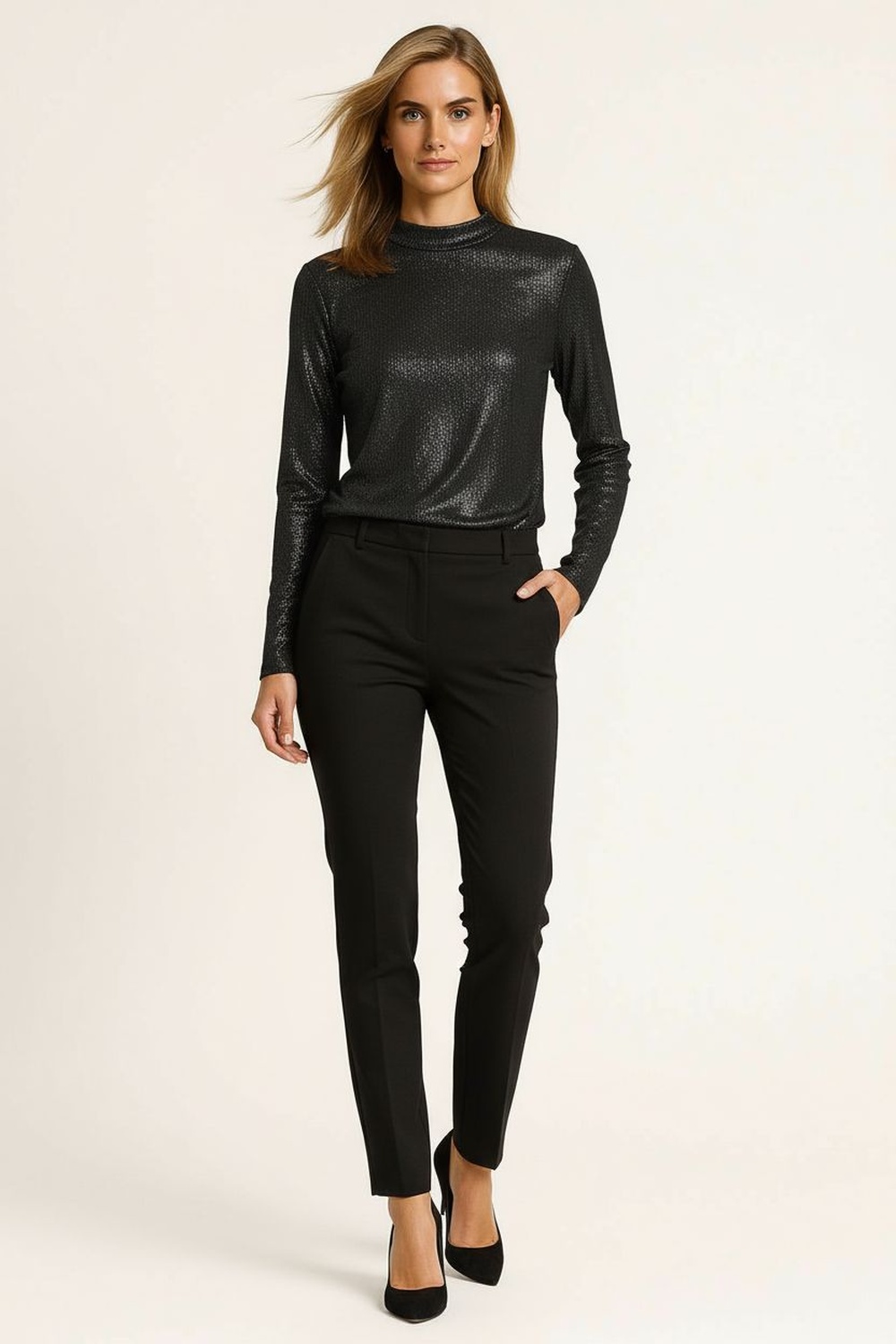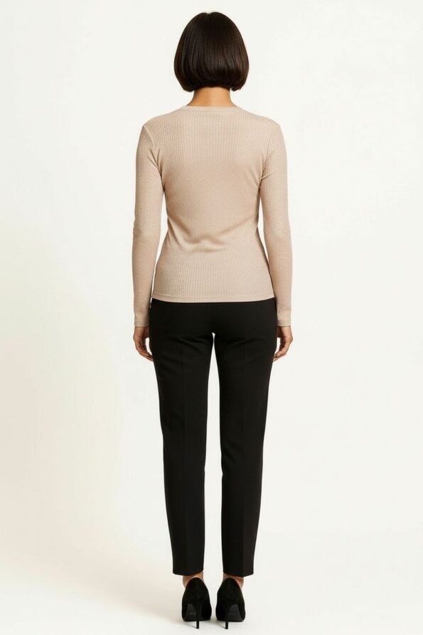 Playera de manga larga con diseño ajustado que realza la figura, cuello redondo que ofrece un acabado limpio y sofisticado, confeccionada en tejido metálico con textura ligera que brinda un toque moderno y elegante, costuras discretas que mantienen la estructura y confort durante el uso diario