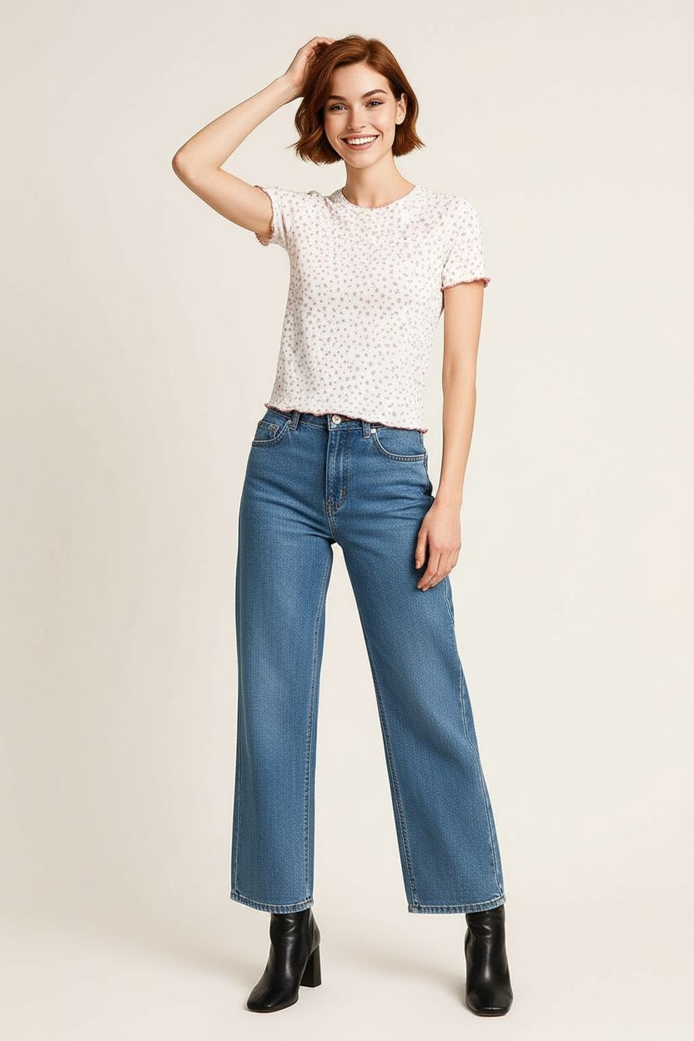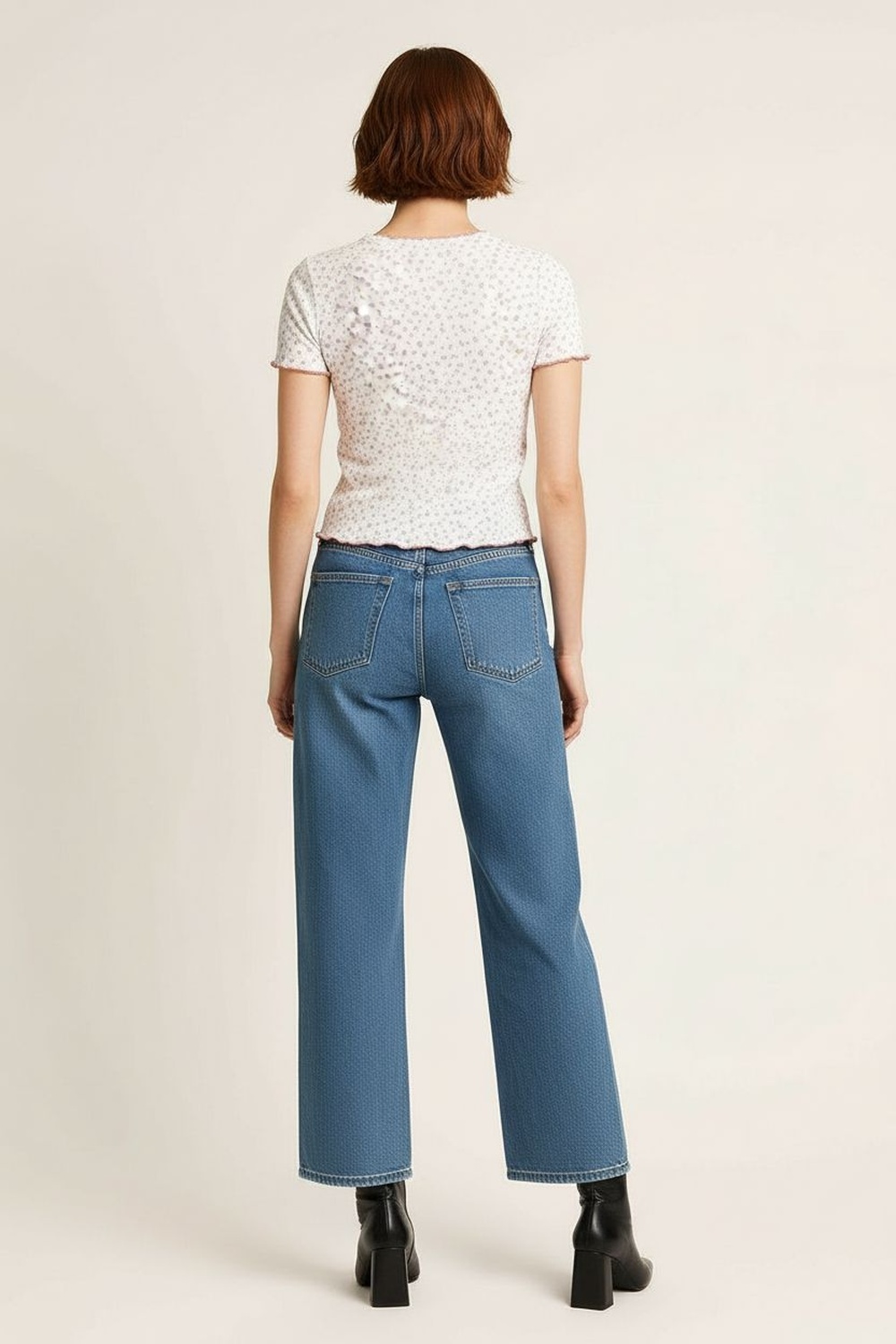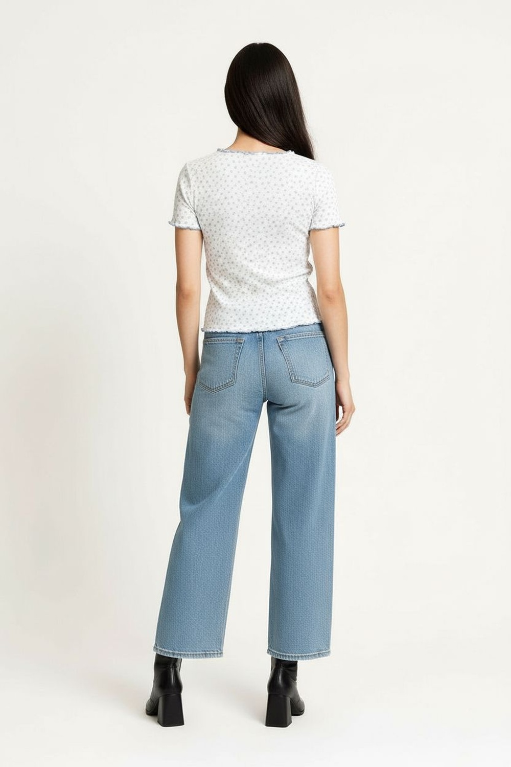 Playera de manga corta con escote redondo, silueta recta al torso, textura ligera con mini print floral, terminación suave en mangas y ruedo