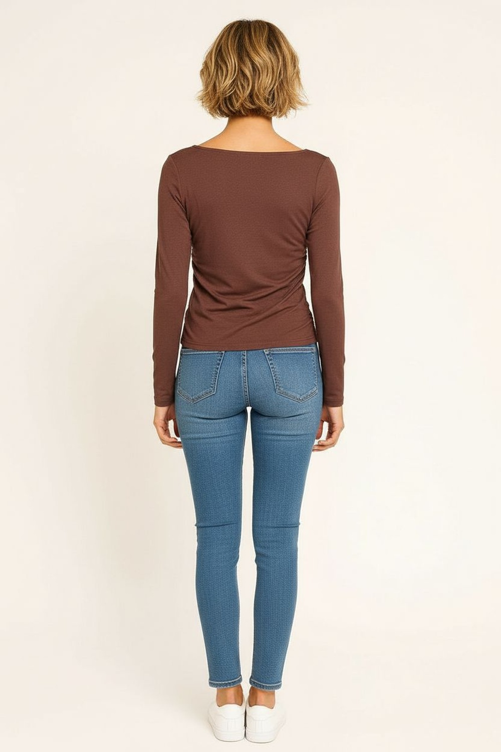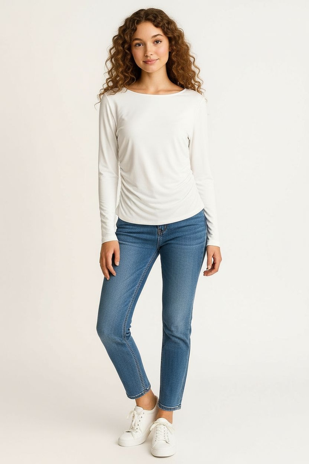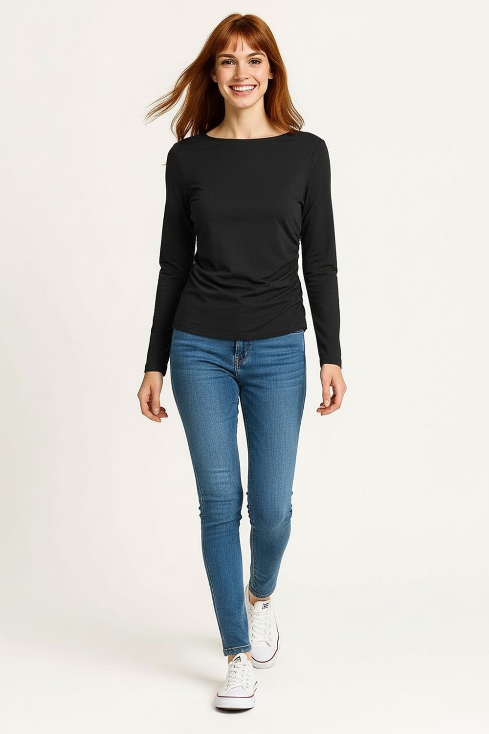 Playera de manga larga con cuello amplio, confeccionada en tejido ligero con textura plizada, ajuste ceñido que se adapta al torso, superficie uniforme con caída natural, terminaciones limpias para mayor comodidad