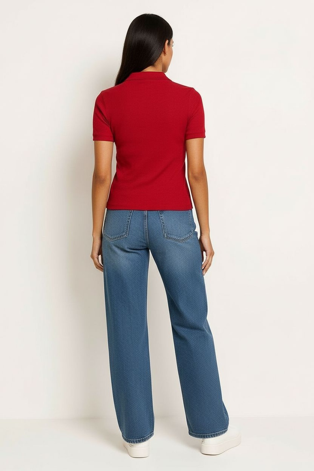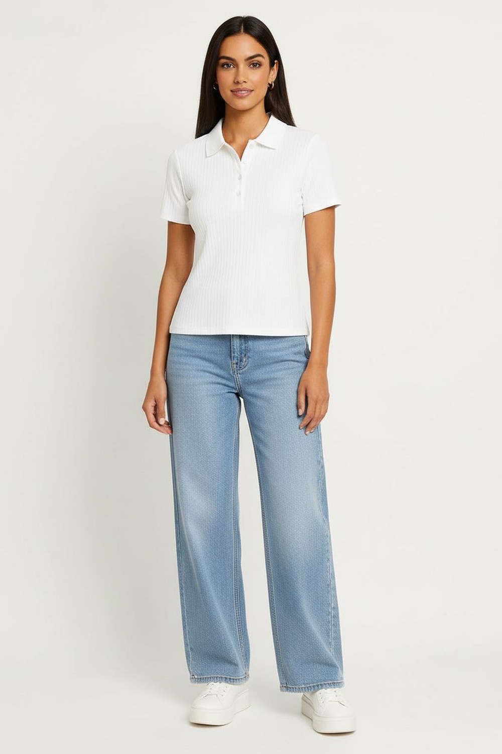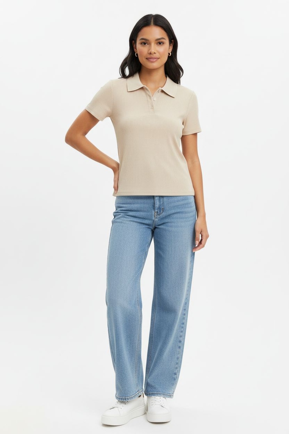 Playera tipo polo en tono suave con textura acanalada, cuello sport clásico y botonadura al frente, estilo casual y relajado, ideal para un look atlético con un twist femenino