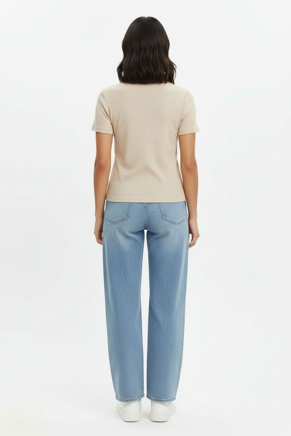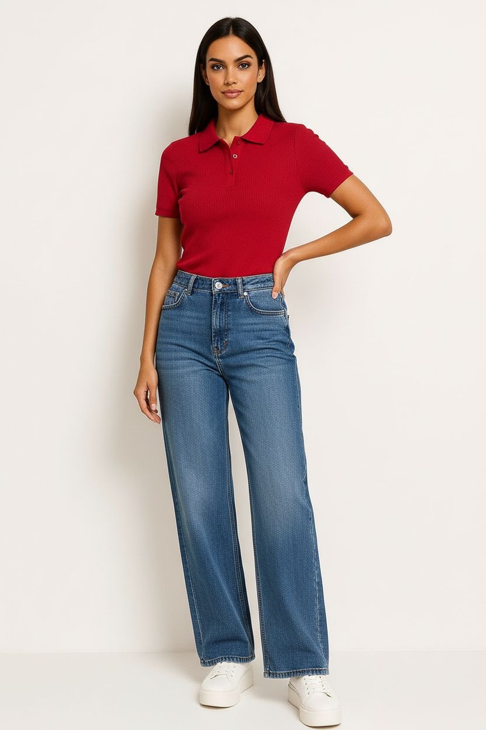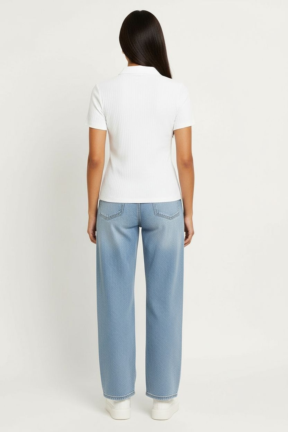 Playera tipo polo en tono suave con textura acanalada, cuello sport clásico y botonadura al frente, estilo casual y relajado, ideal para un look atlético con un twist femenino