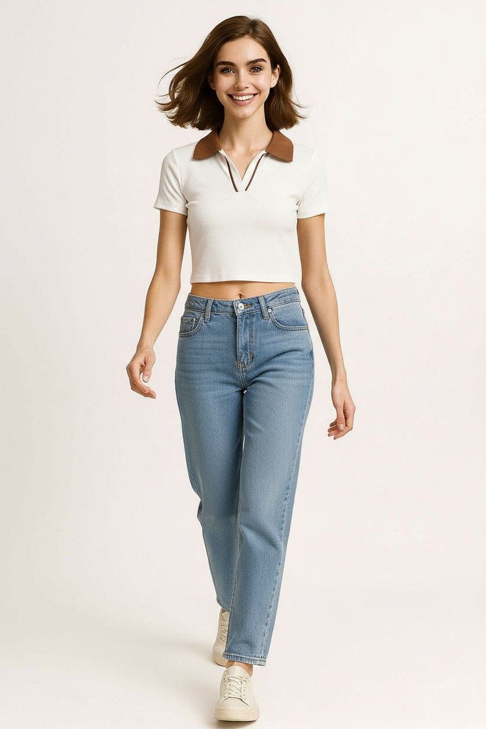 Playera de largo corto con cuello tipo polo que aporta un acabado estructurado, escote frontal con apertura funcional que facilita el ajuste, manga corta que brinda comodidad, confección en tejido rib de textura firme que se adapta al cuerpo, terminaciones limpias en dobladillos que conservan la forma