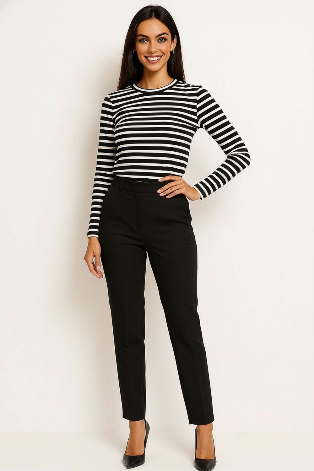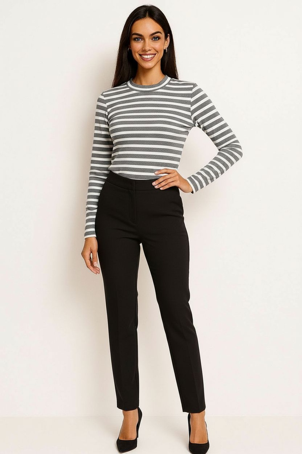 Playera confeccionada en tejido rib velour con acabado suave y textura acanalada, cuello redondo alto con terminación limpia que aporta estructura, mangas largas que brindan cobertura y confort, silueta ajustada que resalta la figura, confección en material elástico que favorece la movilidad y el buen calce