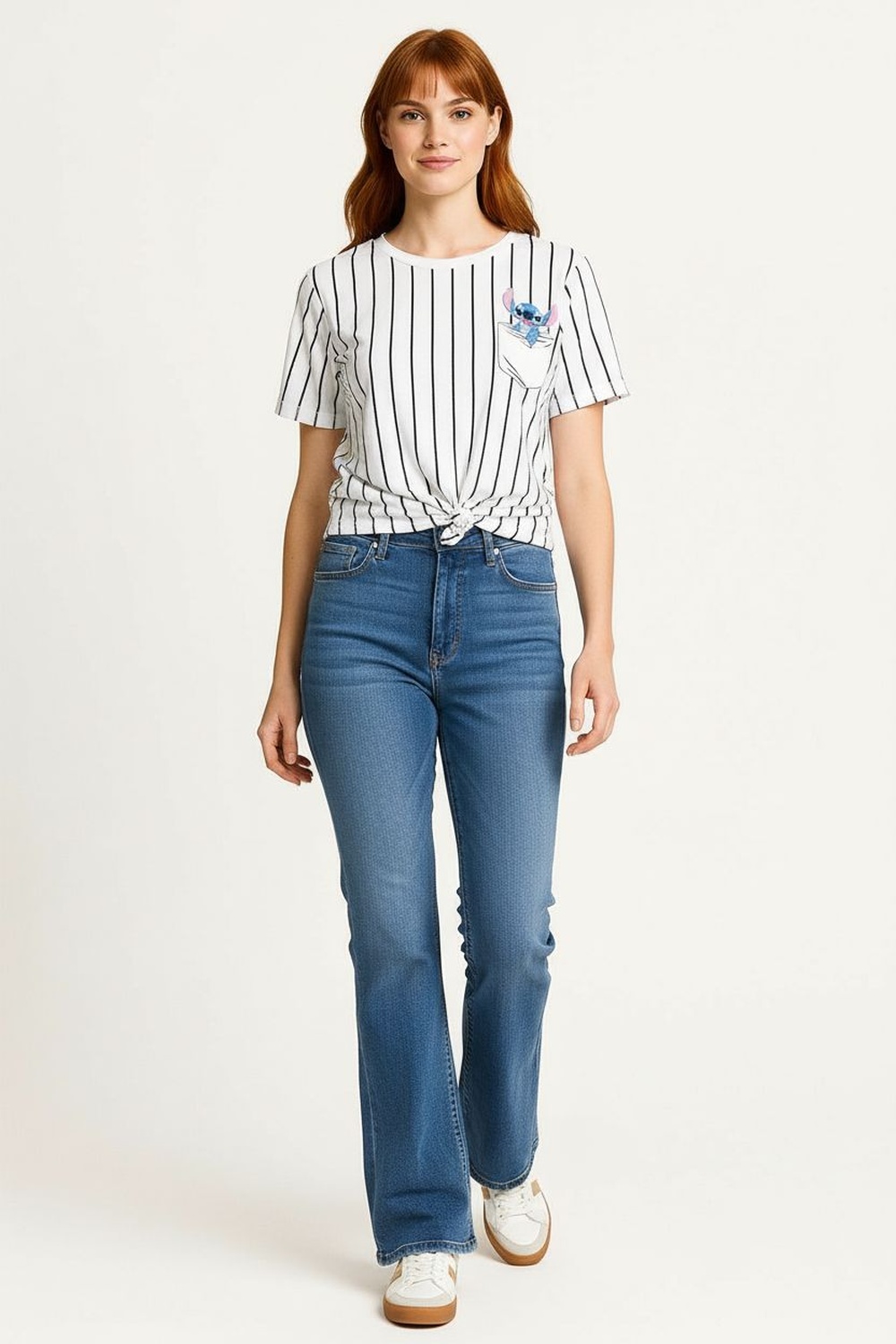 Playera con patrón lineal continuo que aporta detalle visual, cuello redondo con ribete firme que conserva forma, mangas cortas con dobladillo marcado, bolsillo frontal aplicado que añade funcionalidad, nudo lateral integrado que ajusta silueta de manera natural