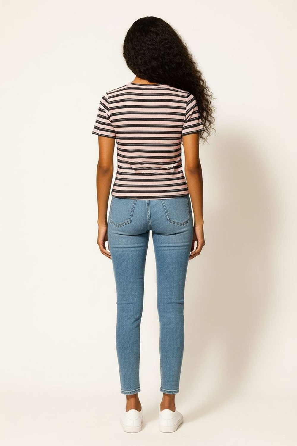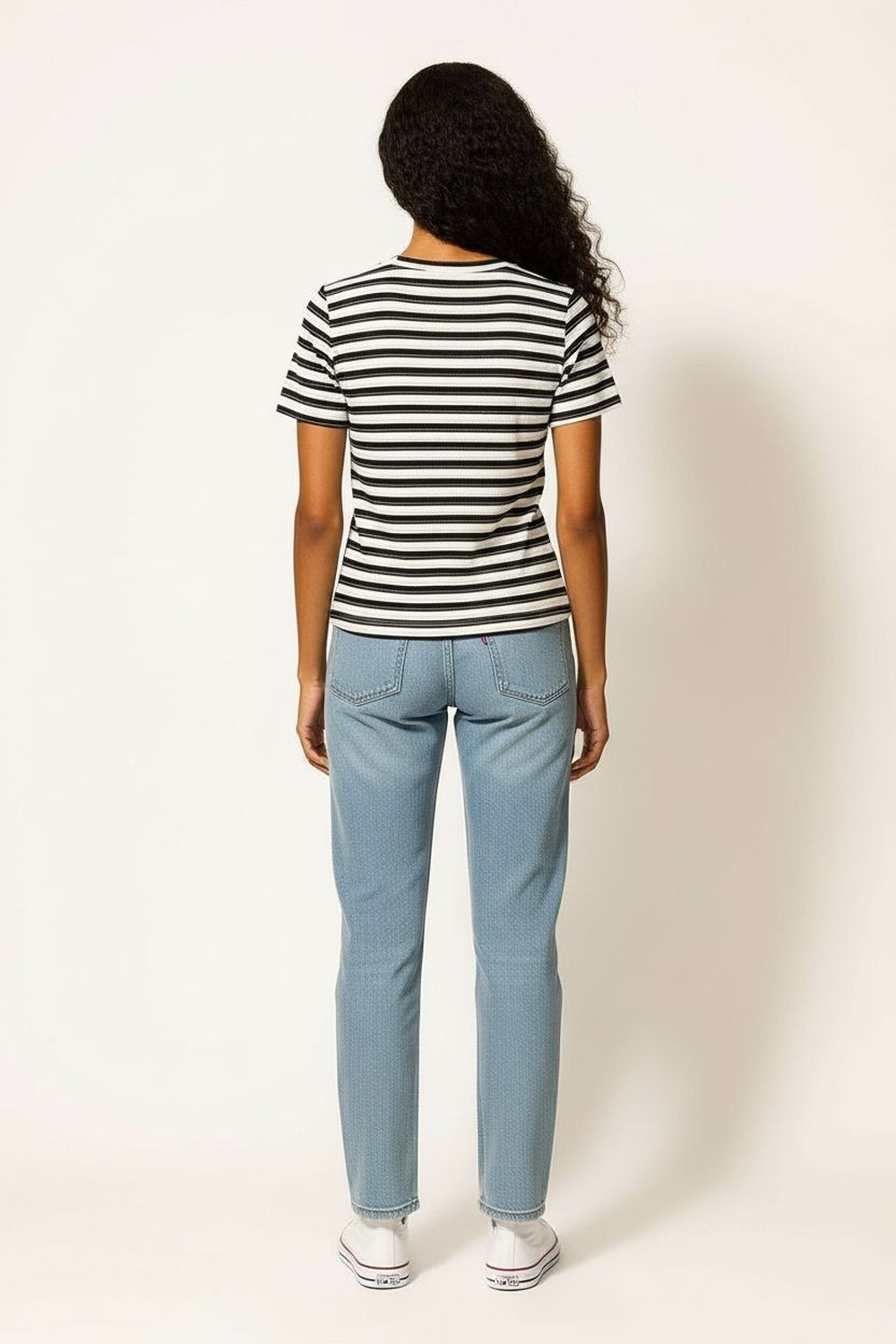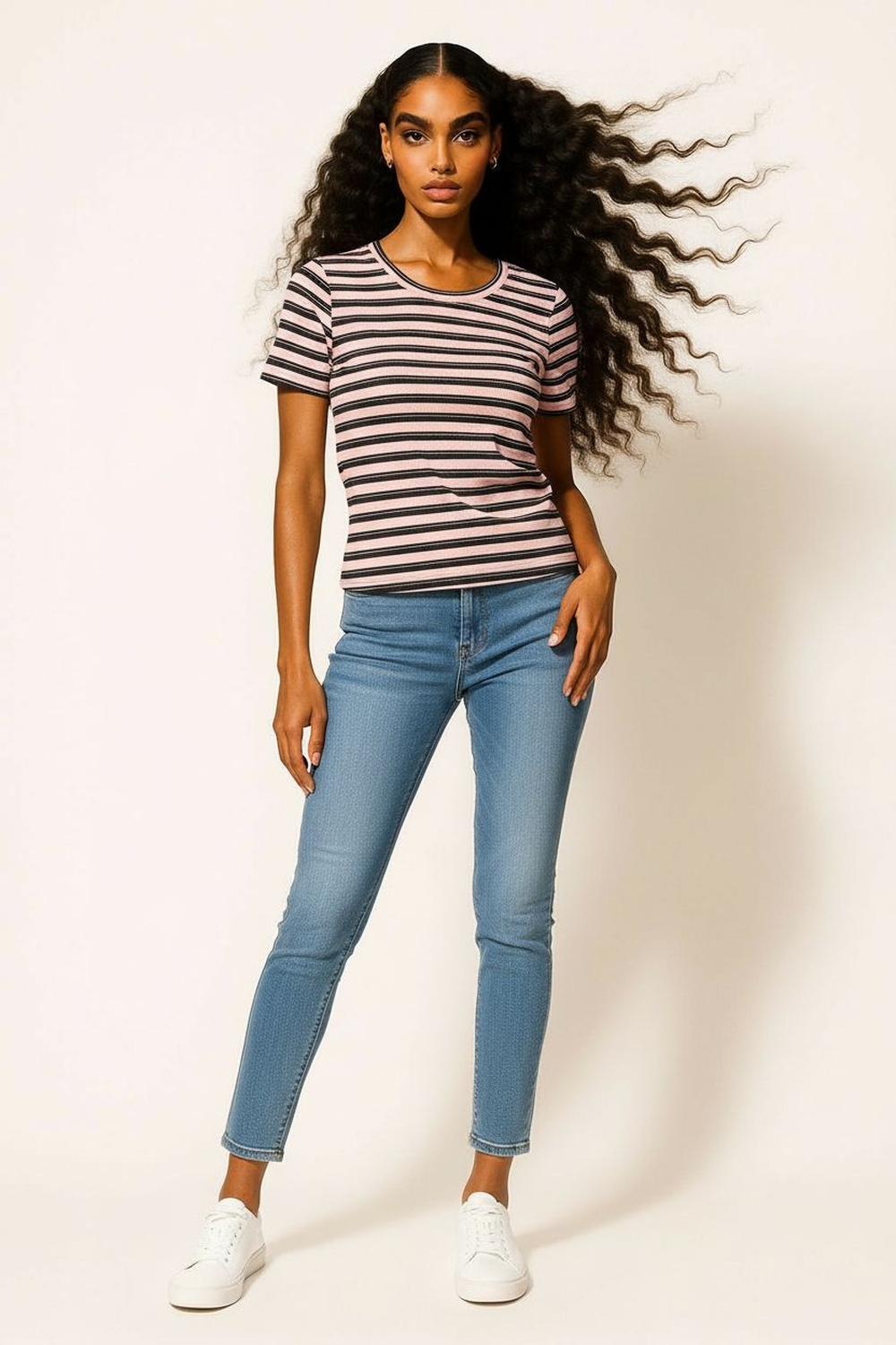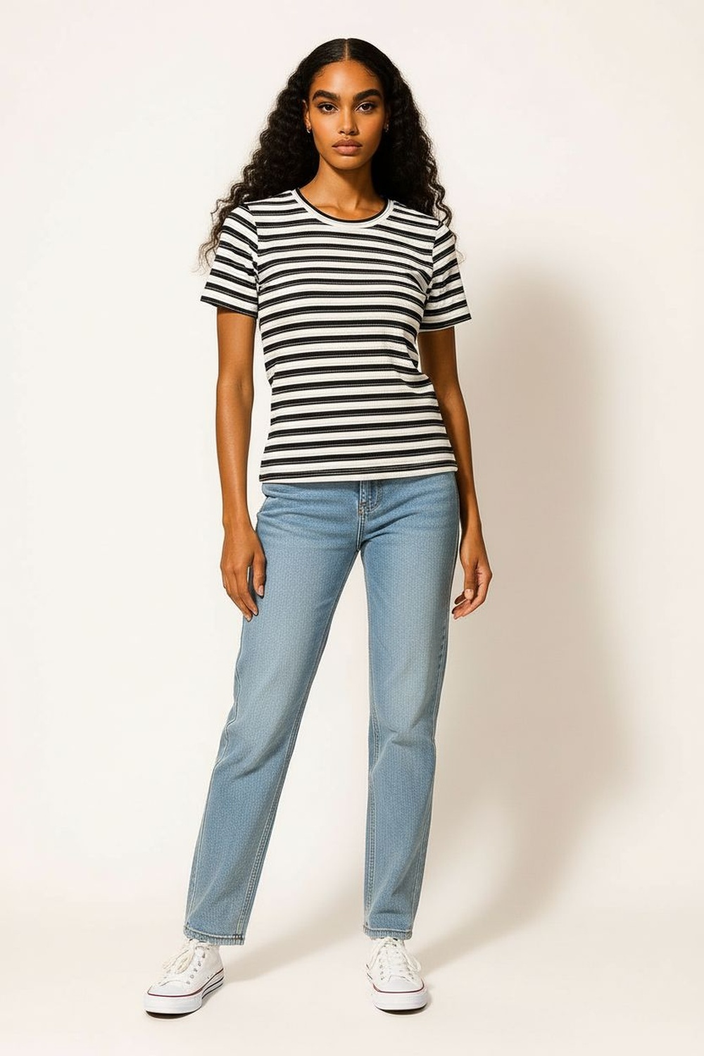 Playera de manga corta con cuello redondo clásico, confección en tejido rib que aporta ajuste cómodo al cuerpo, estructura flexible que permite libertad de movimiento, largo regular que facilita un uso versátil, acabado limpio en cuello y mangas que mantiene la forma de la prenda