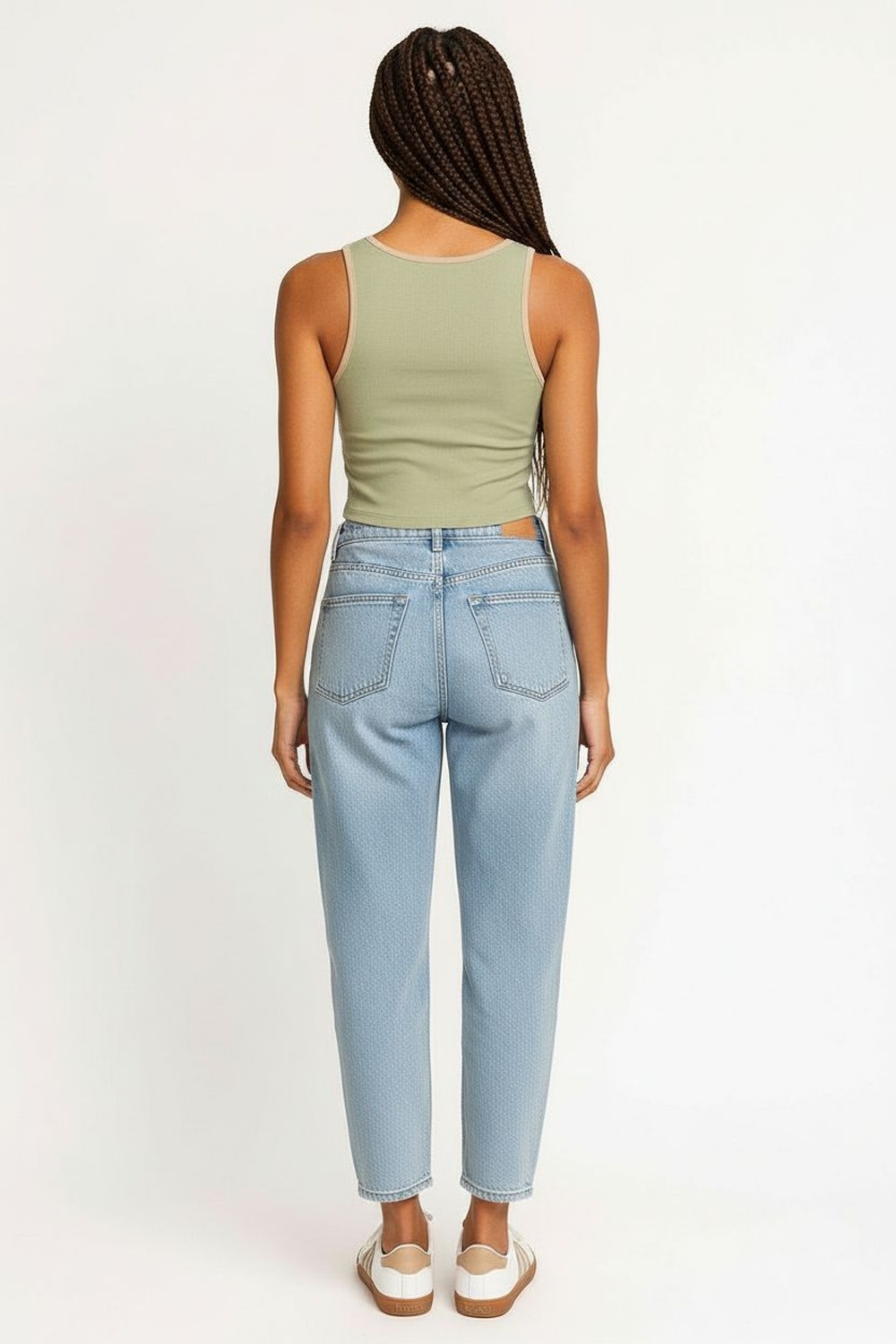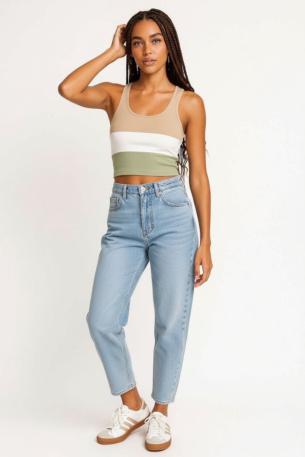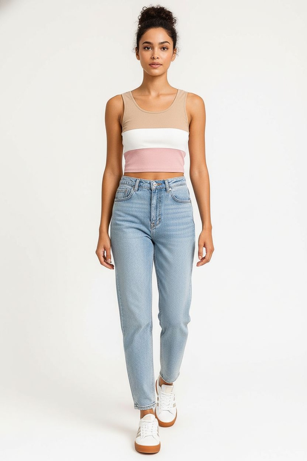 Playera sin mangas de tejido acanalado combinada con bloques de textura, cuello redondo cerrado y diseño ajustado que aporta un estilo fresco y versátil, confeccionada con tela elástica que permite libertad de movimiento