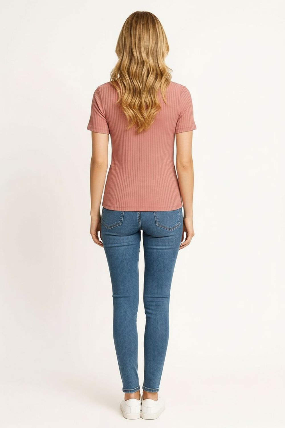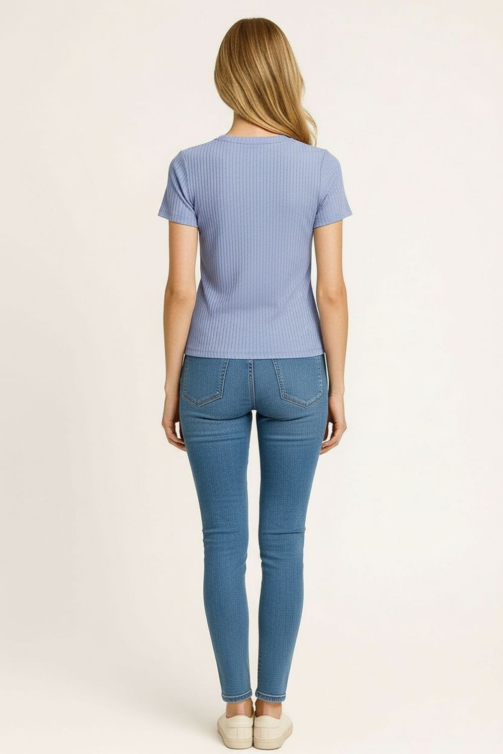 Playera de manga corta con cuello redondo y estructura ajustada, confección en tejido acanalado que aporta elasticidad y soporte, largo a la cadera con caída uniforme, terminaciones limpias en mangas y bajo que mantienen una silueta definida y cómoda