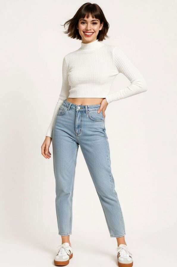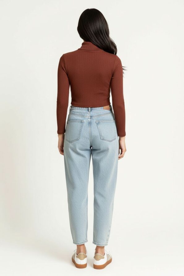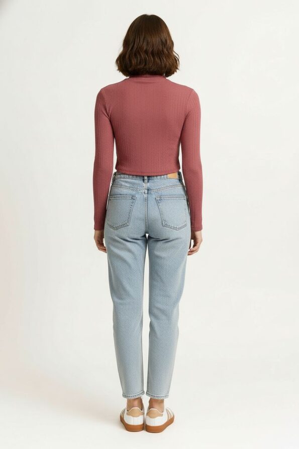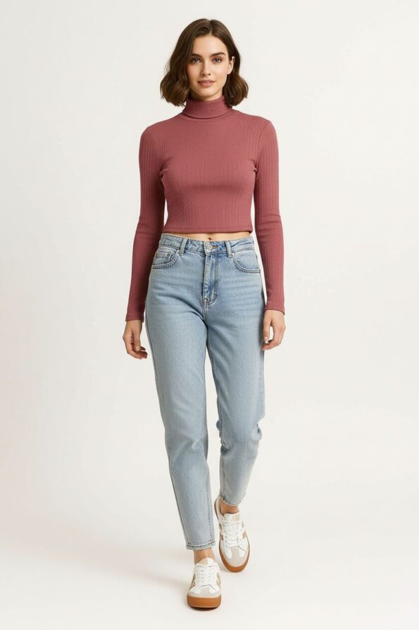 Playera de tejido rib con textura maquilla que aporta calidez y comodidad, cuello alto tipo ruso que estiliza el cuello y ofrece un toque elegante, manga larga con ajuste ceñido que realza la silueta, confección elástica que permite libertad de movimiento y un ajuste perfecto al cuerpo