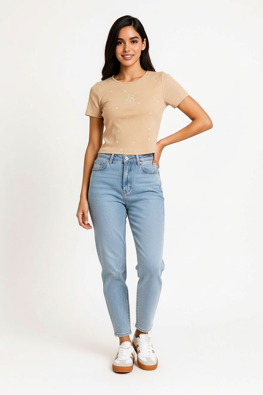 Suéter corto de manga larga con aplicación numérica al frente que aporta un estilo juvenil y moderno, cuello redondo de punto acanalado que brinda comodidad, confección en tejido de viscosa suave con acabado elástico que se adapta al cuerpo, diseño casual con textura ligera que combina confort y tendencia