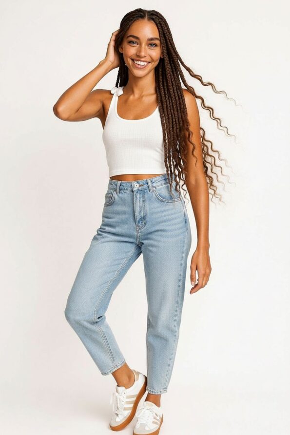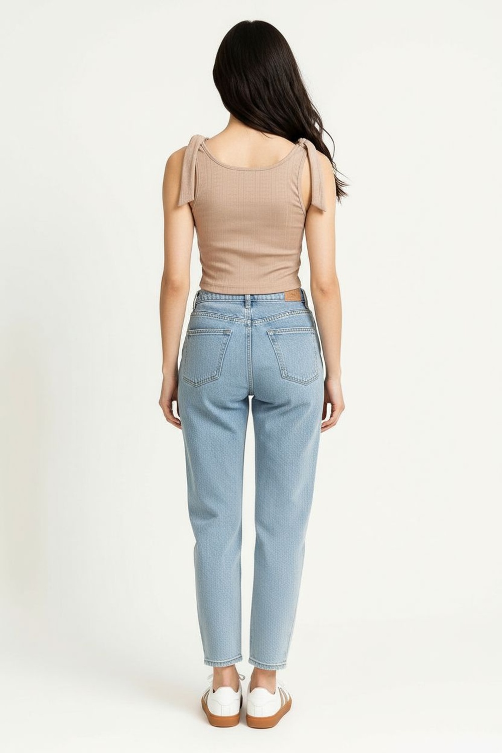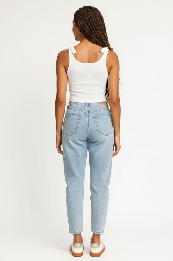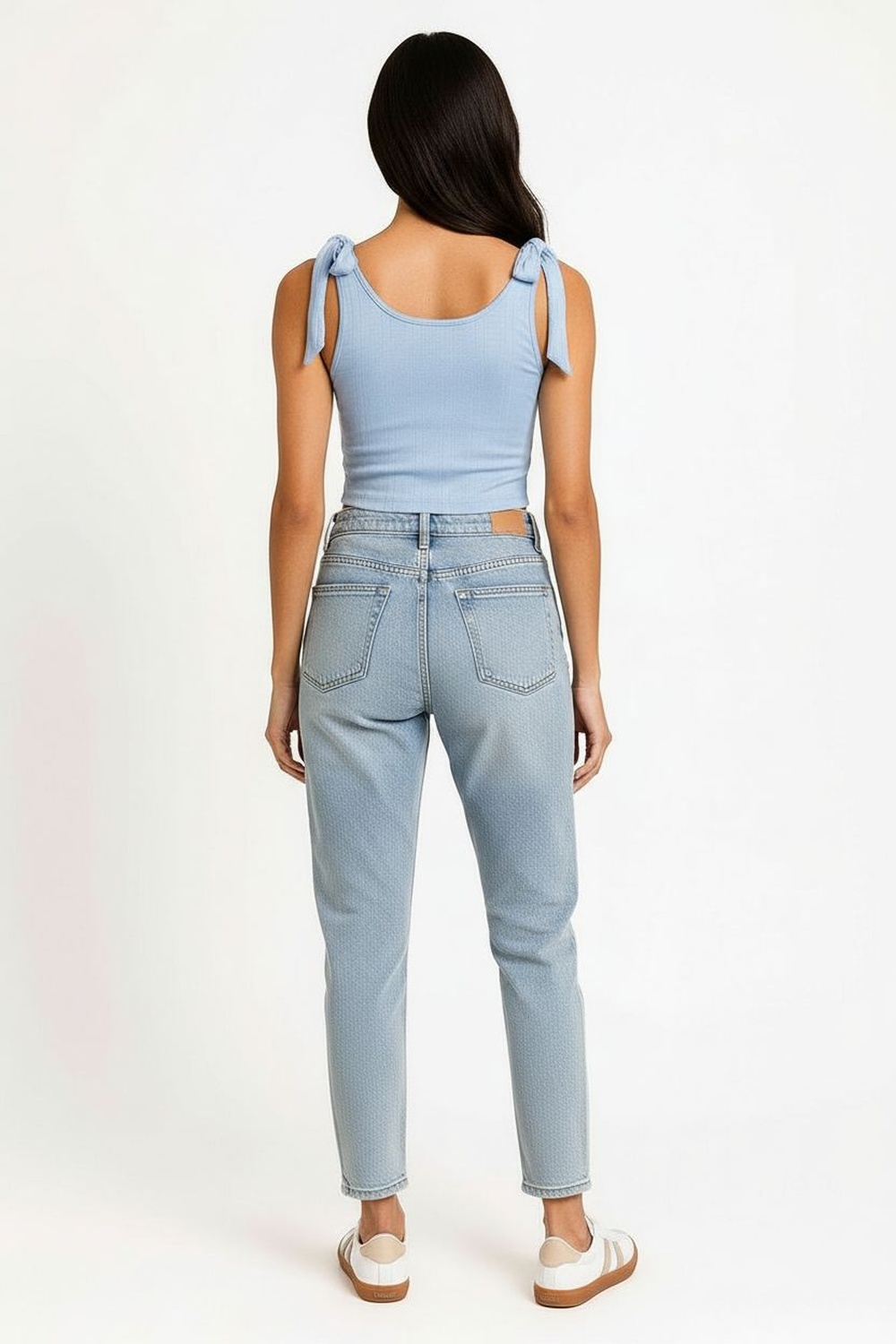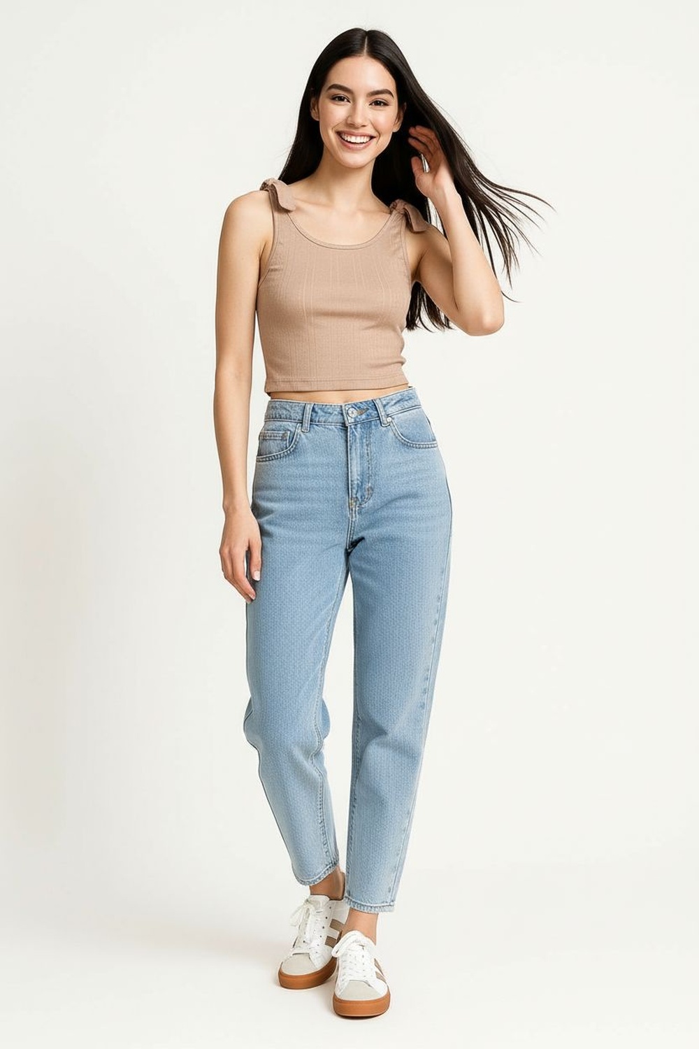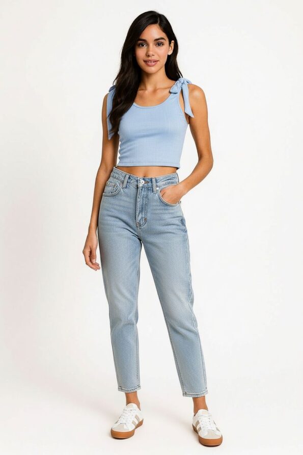 Playera de tejido rib con tirantes ajustables que permiten adaptarse al cuerpo, diseño con listones decorativos que aportan un detalle moderno y femenino, corte corto que realza la cintura y favorece la silueta, confección ligera y elástica que garantiza comodidad y frescura durante el día