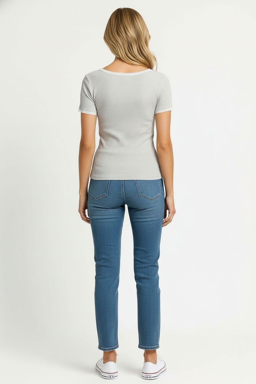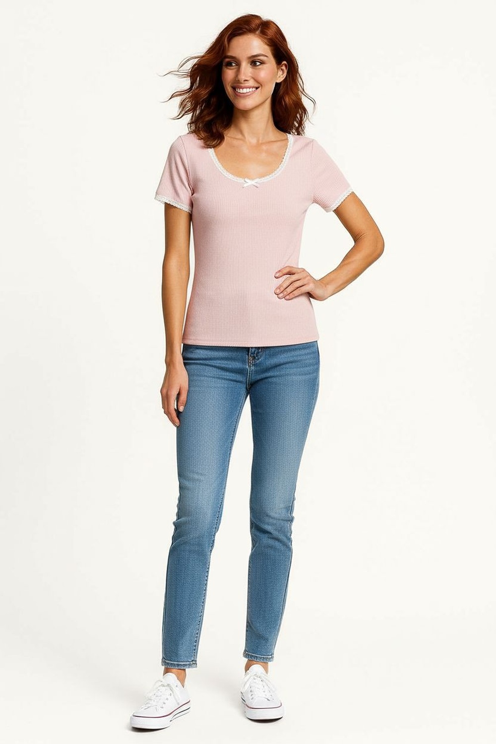 Playera de corte ajustado confeccionada en tejido rib suave y elástico, con cuello redondo adornado con delicado borde curly y pequeño moño al tono que añade un toque romántico