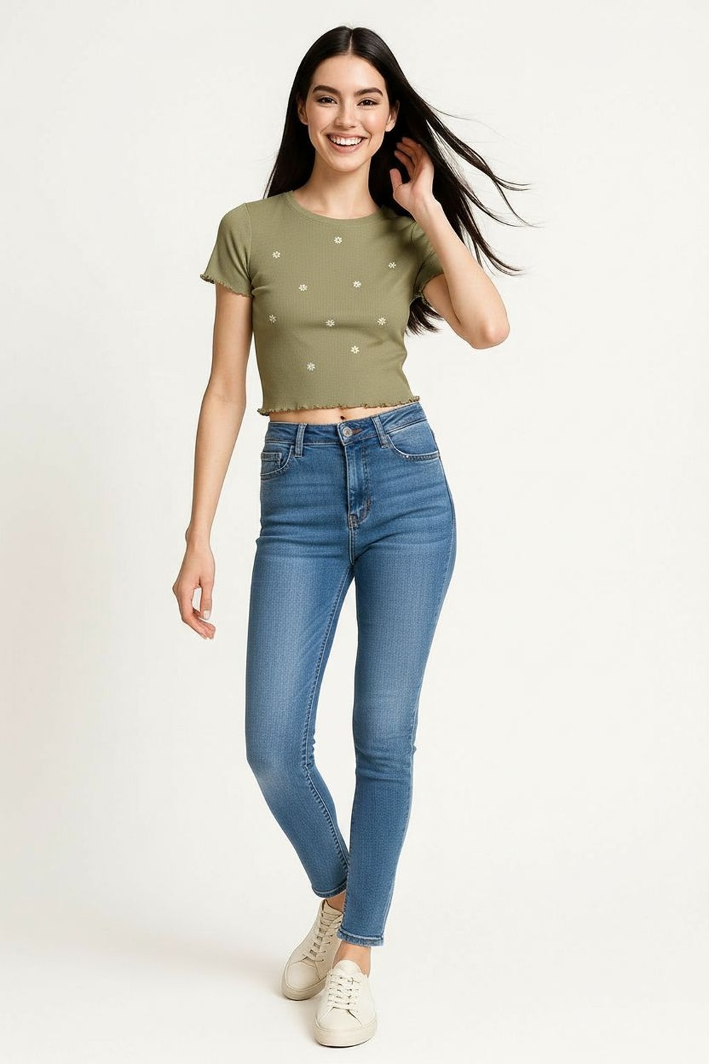 Playera de tejido rib con textura acanalada que se ajusta suavemente al cuerpo, manga corta con terminación ondulada que aporta dimensión, detalle bordado frontal que enriquece la prenda, dobladillo con acabado ondulado que genera movimiento, confección suave con elasticidad ligera para mayor confort