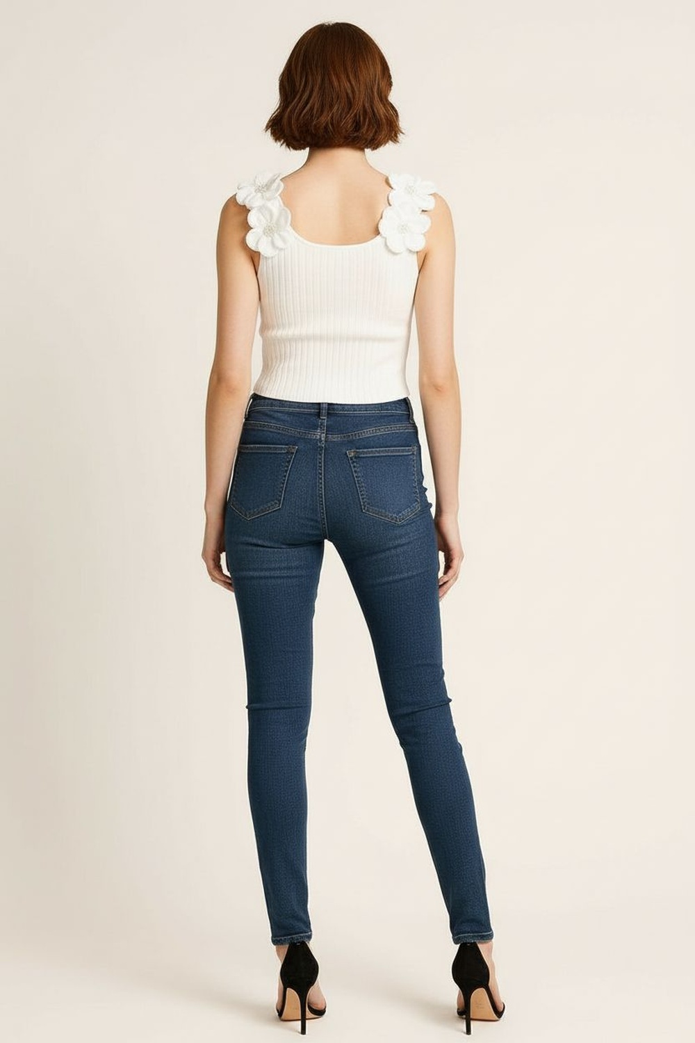 Playera sin mangas, cuello redondo, textura rib, aplicación de flores en tirantes, ajuste al cuerpo, acabado suave