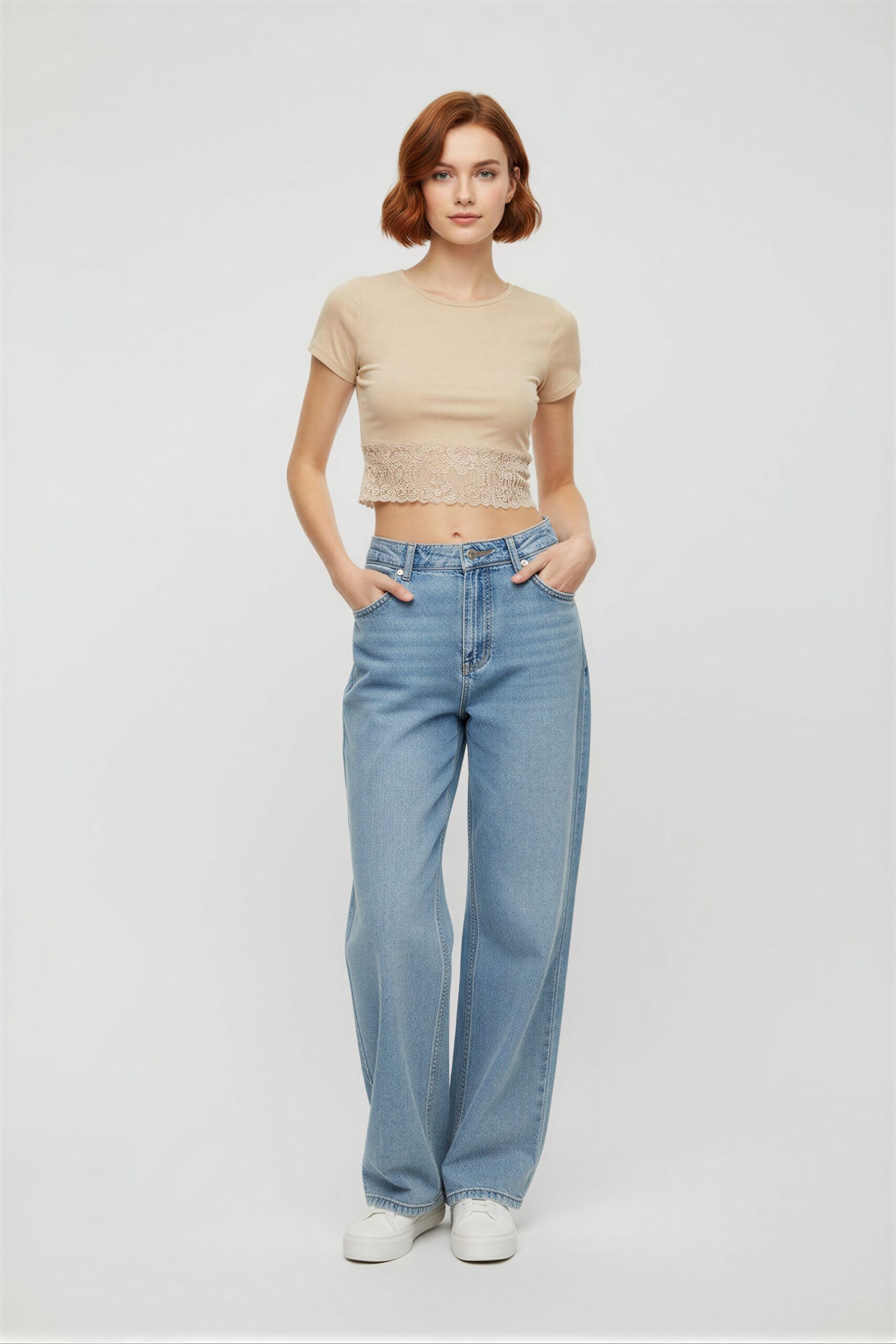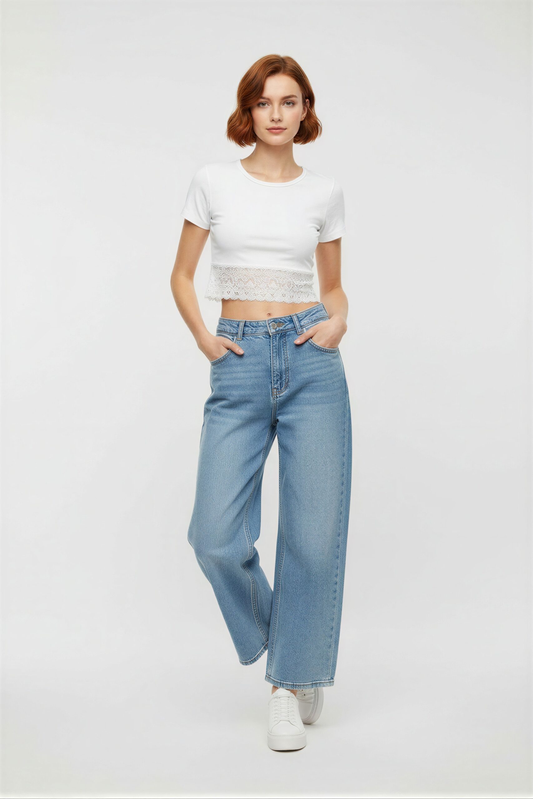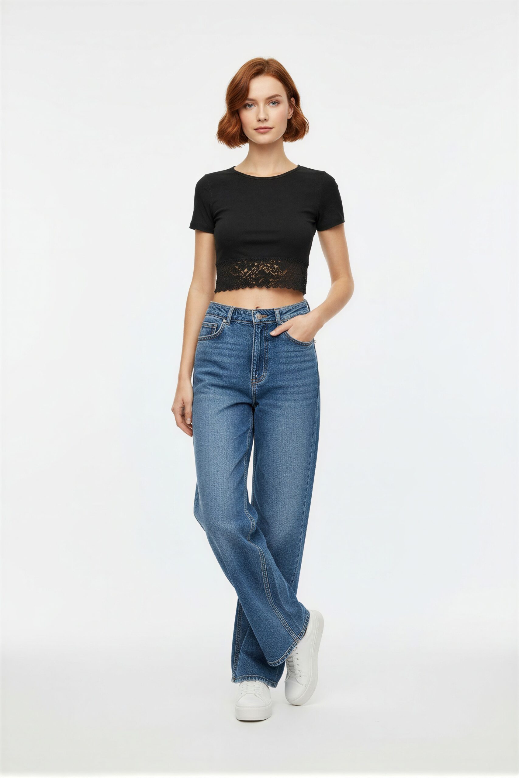 Playera corta con textura acanalada, manga corta, ajuste al cuerpo, detalle de encaje en parte inferior, terminado delicado