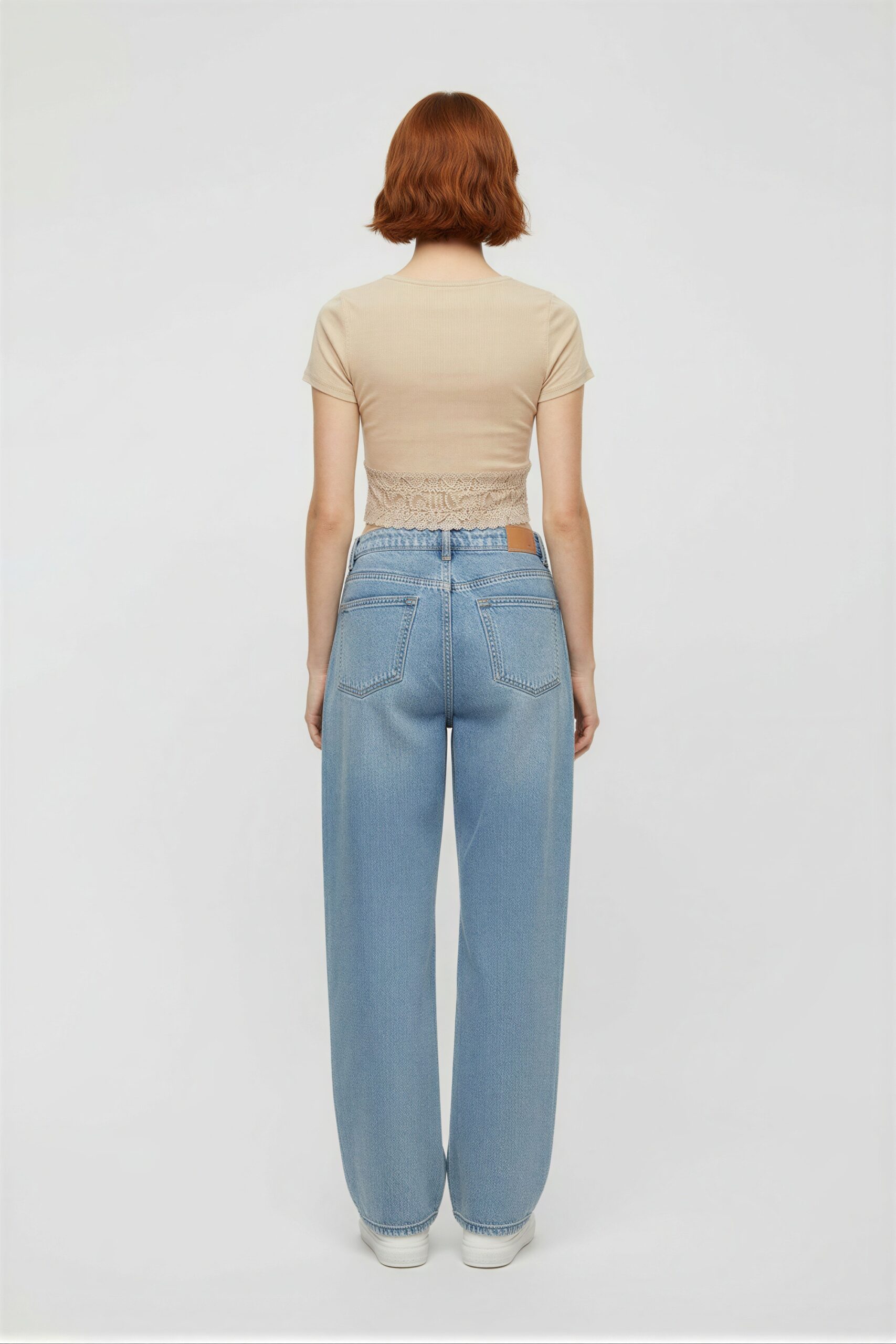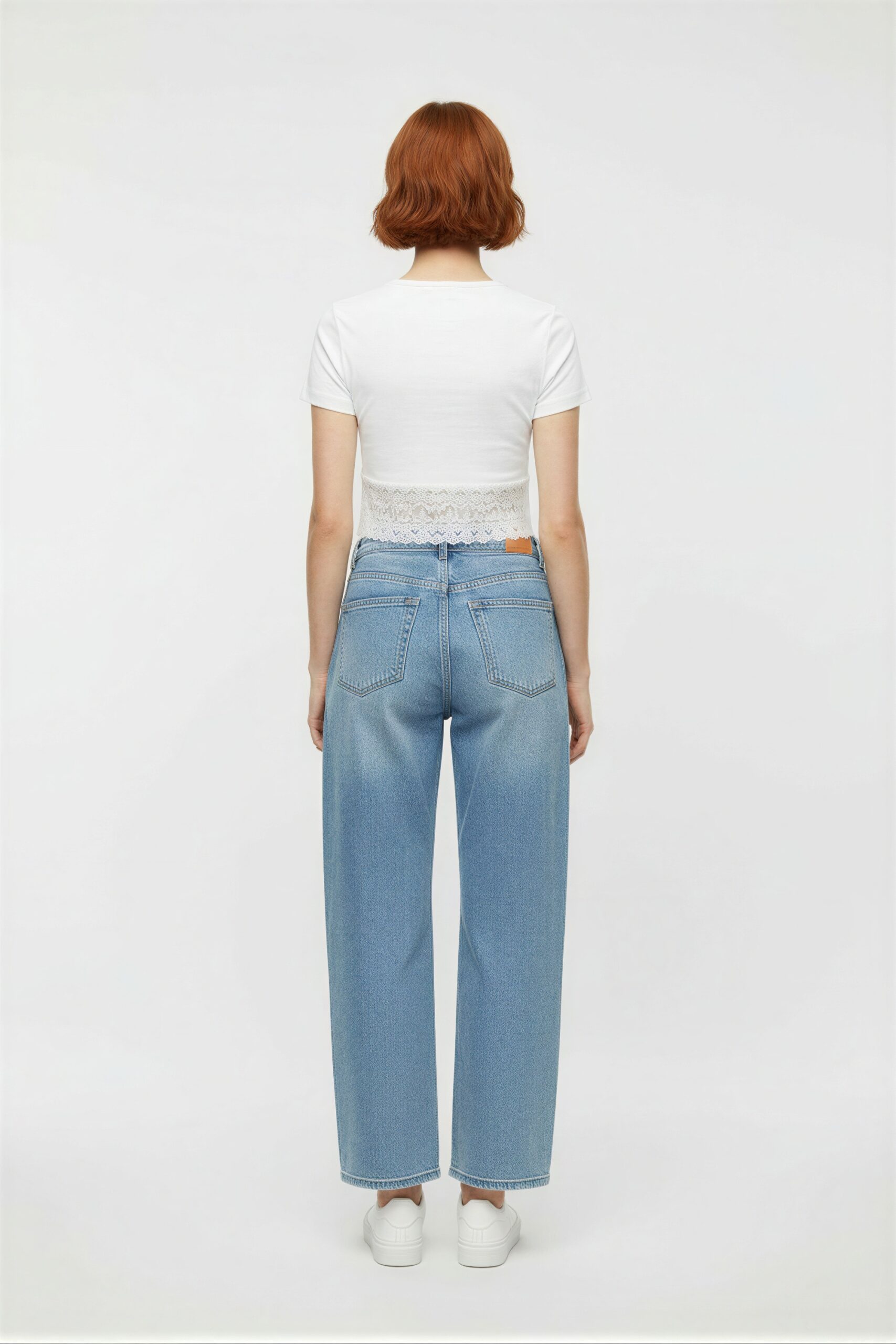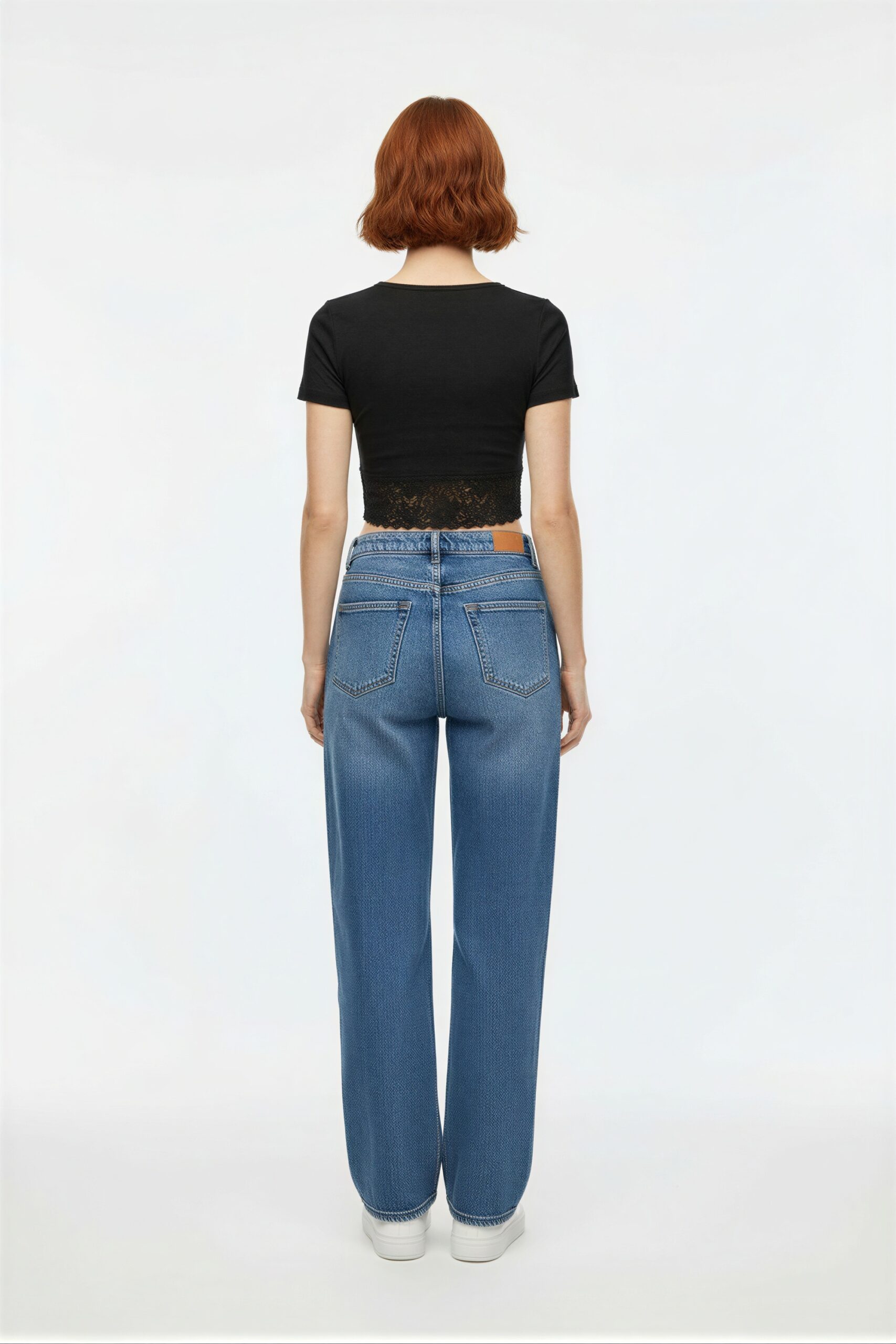 Playera corta con textura acanalada, manga corta, ajuste al cuerpo, detalle de encaje en parte inferior, terminado delicado