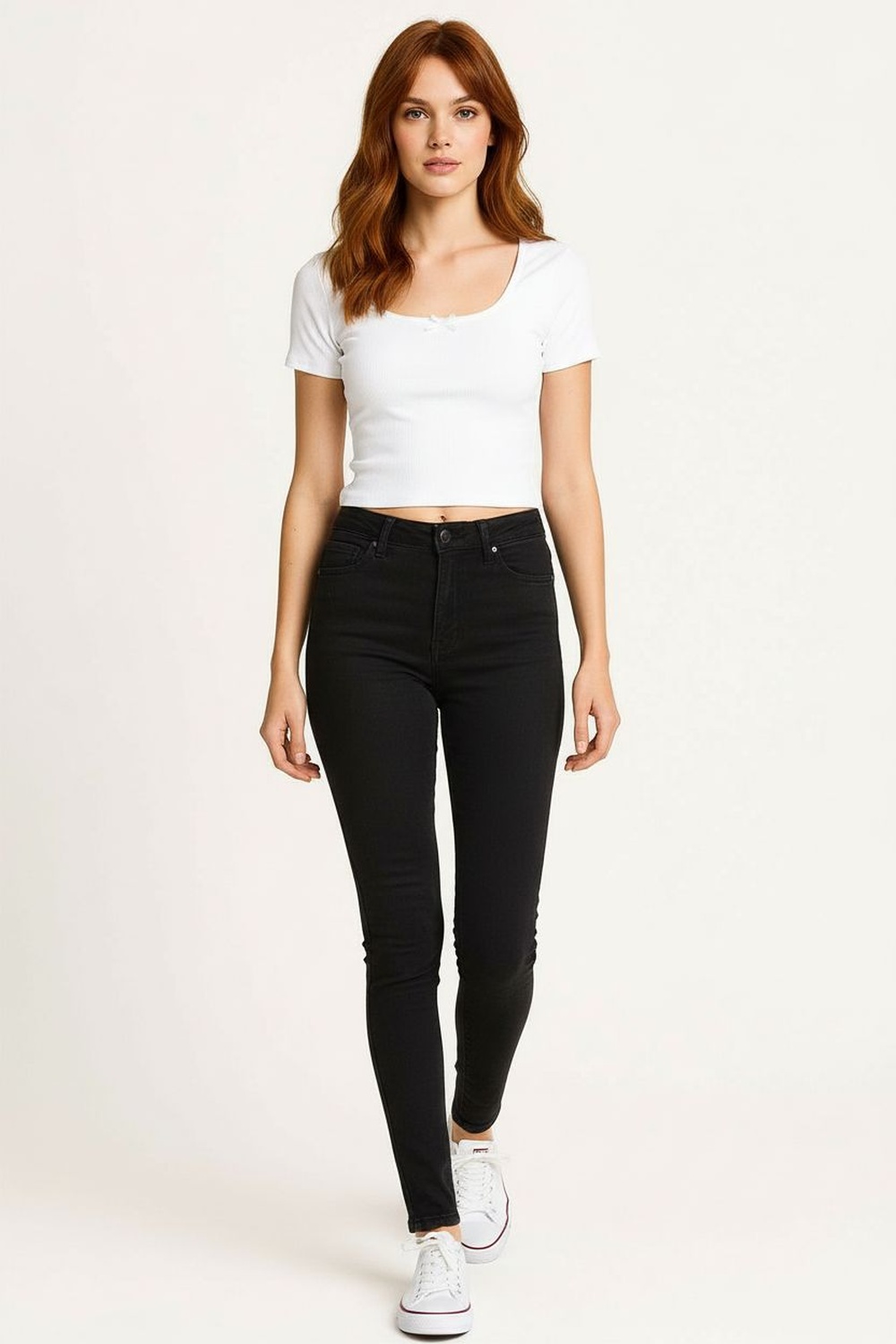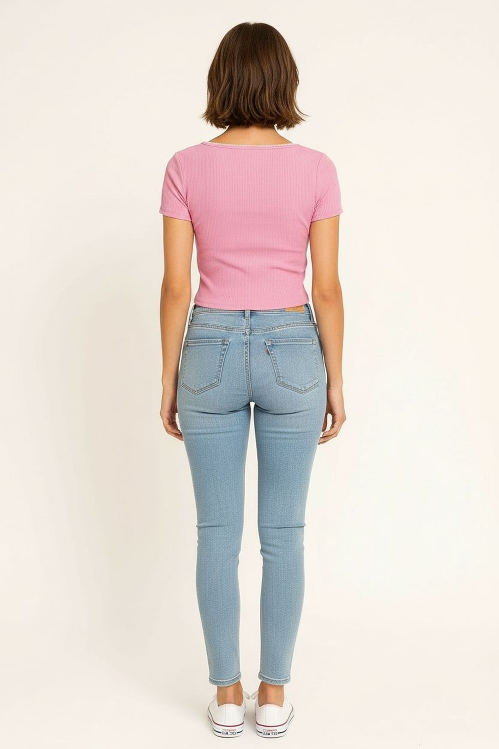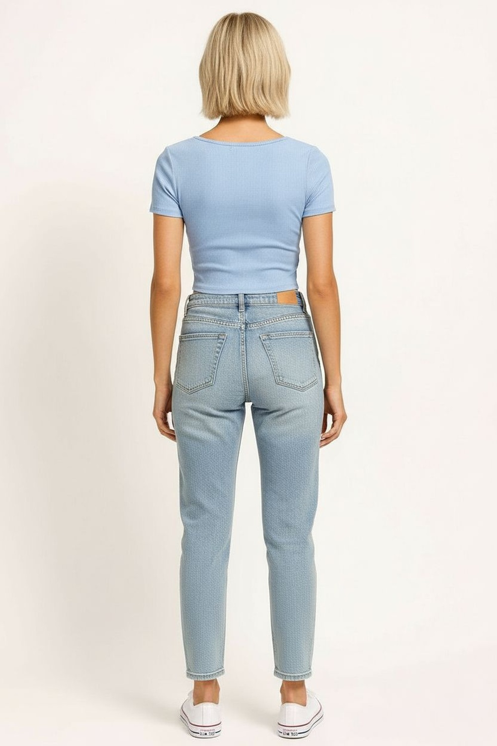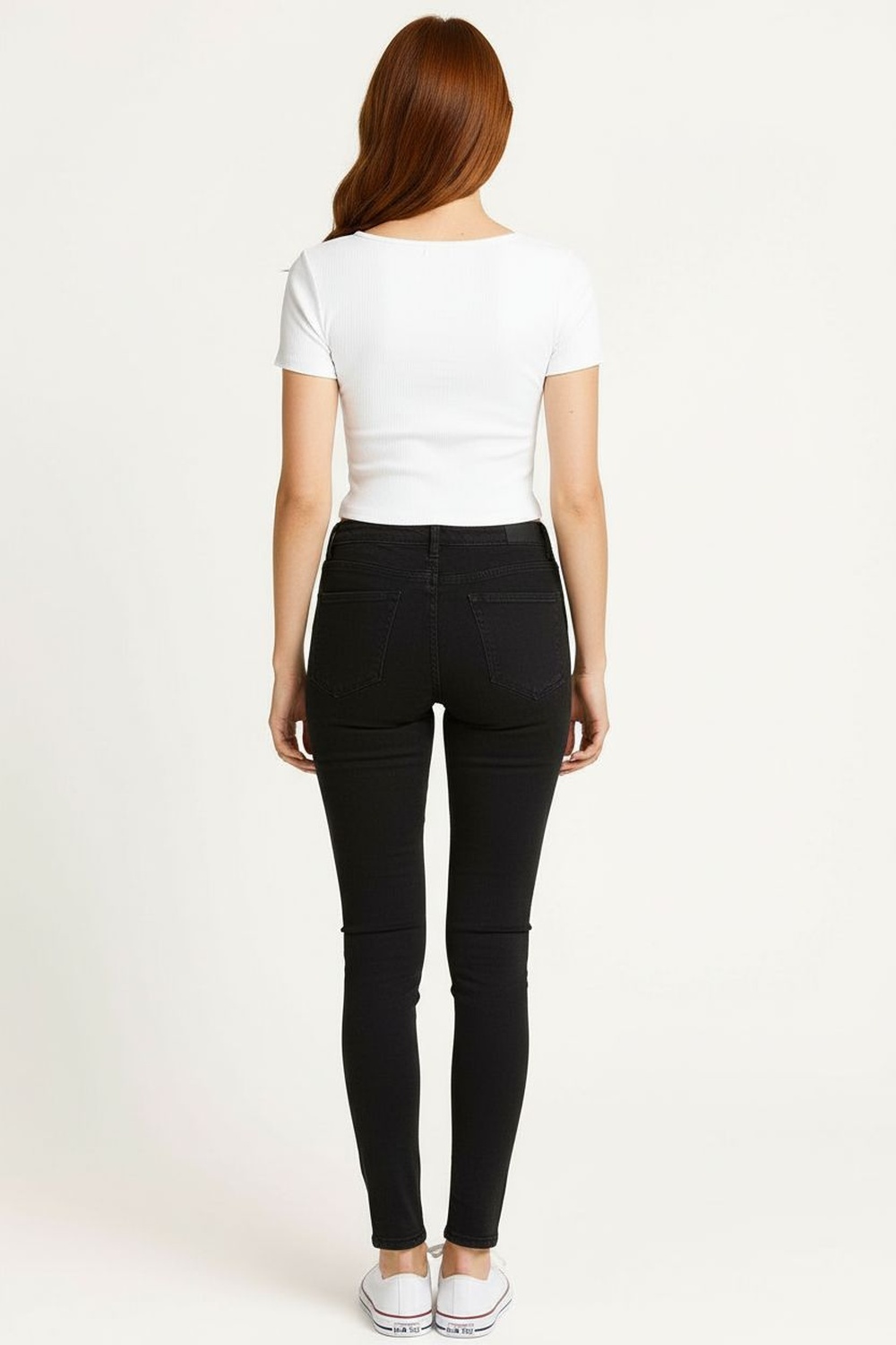 JEANS NYD de tiro medio con cierre frontal y botón metálico para ajuste seguro, pierna ajustada que define la silueta, bolsillos funcionales al frente y espalda, largo completo con caída entallada, confección en mezclilla con elasticidad que brinda comodidad durante el uso