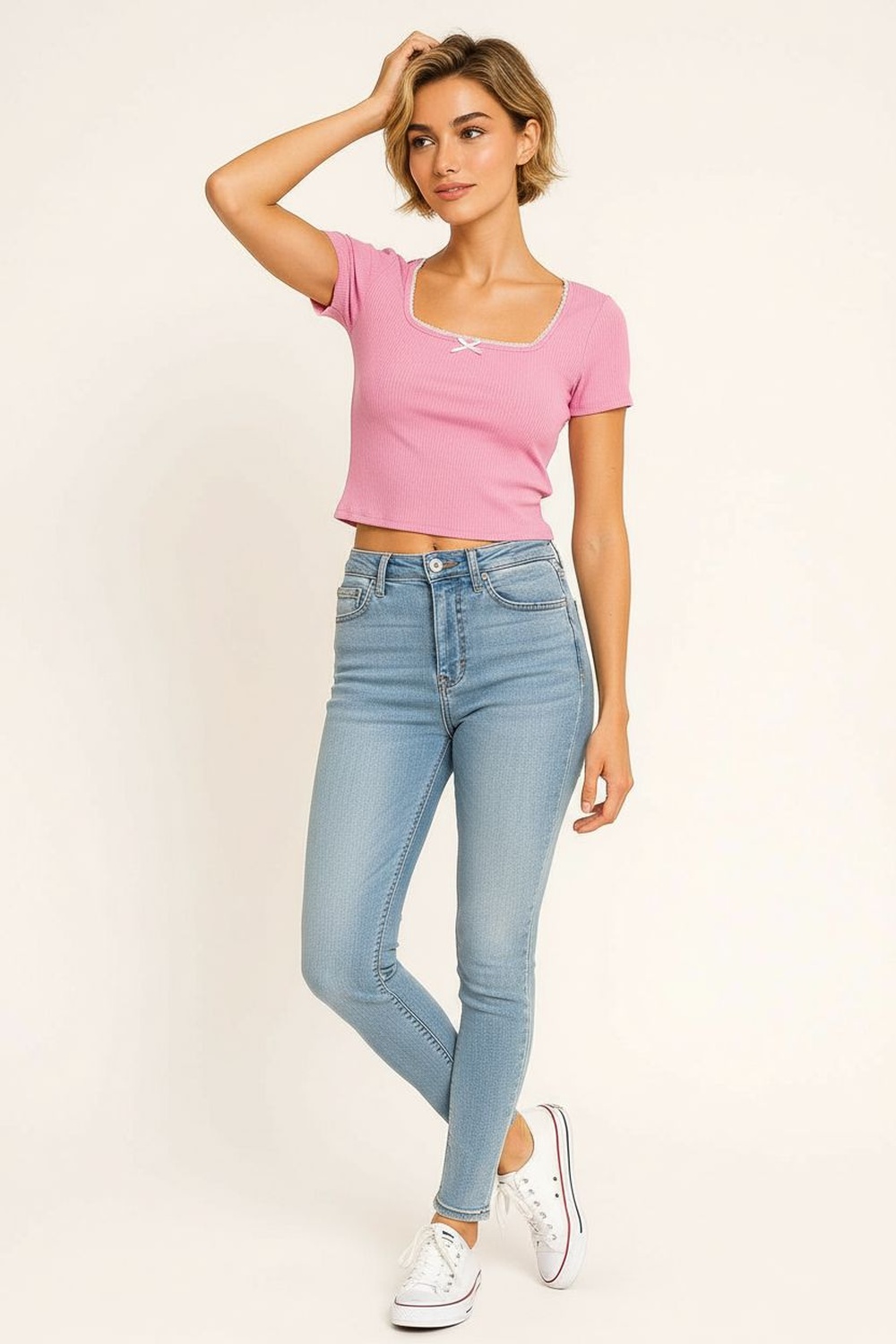 Playera de manga corta con escote redondo y aplicación de encaje delicado en el frente, corte recto con largo a la cintura, confección en tejido rib con elasticidad que permite ajuste cómodo al cuerpo